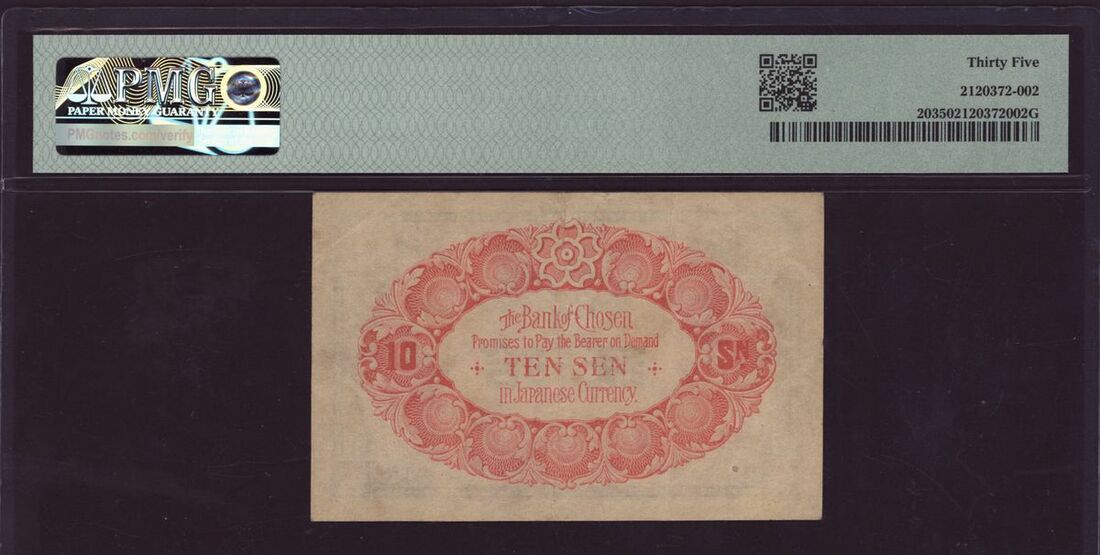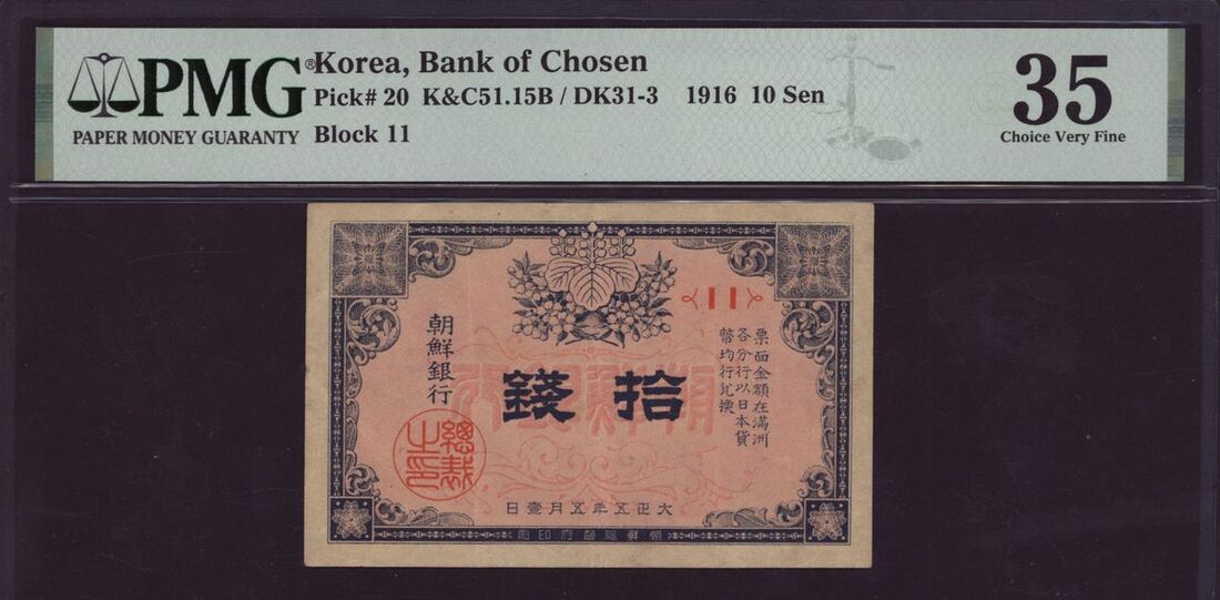 (x) Bank of Chosen, Korea, 10 sen, 1916, block 11 (Pick 20), in PMG holder 35 Choice very Fine
