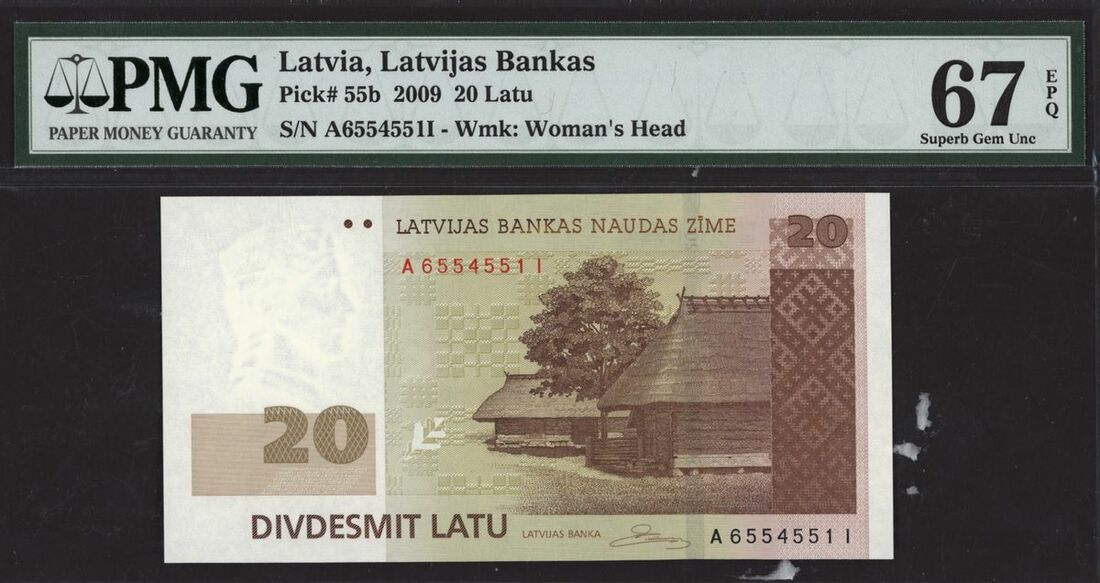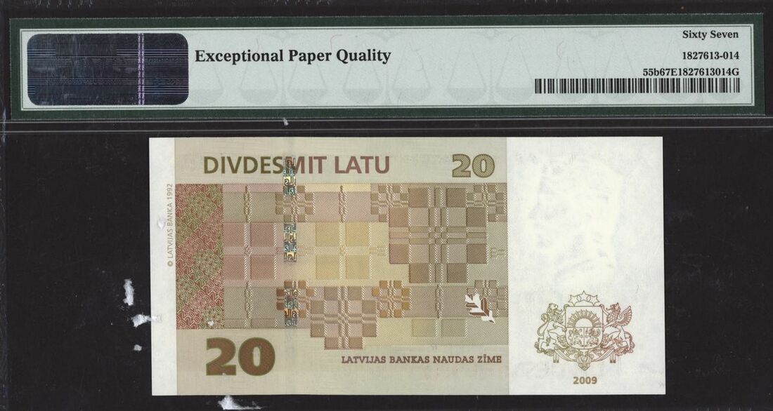 (x) Latvijas Bankas, Latvia, 20 latu, 2009, serial number A6554551I, (Pick 55b), in PMG holder 67 EPQ Superb Gem Uncirculated