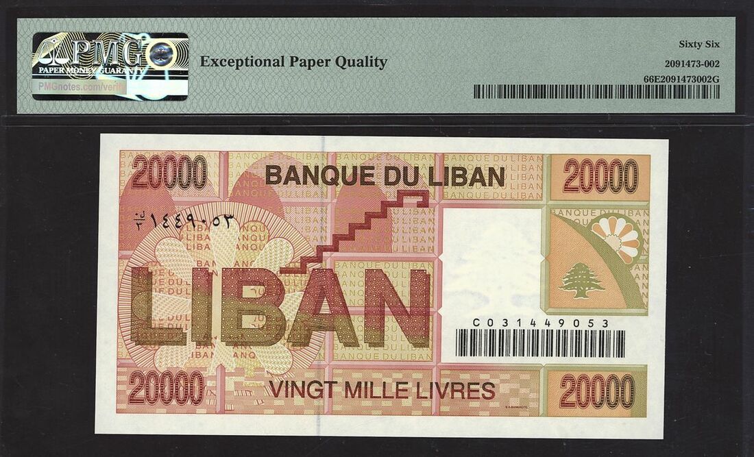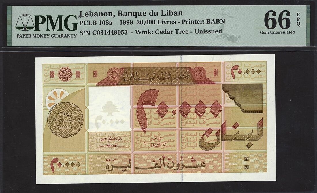 (x) Banque du Liban, Lebanon, unissued 20,000 livres, 1999, serial number C031449053, (BNB 519, PCLB 108a, Pick unlisted), in PMG holder 66 EPQ Gem Uncirculated