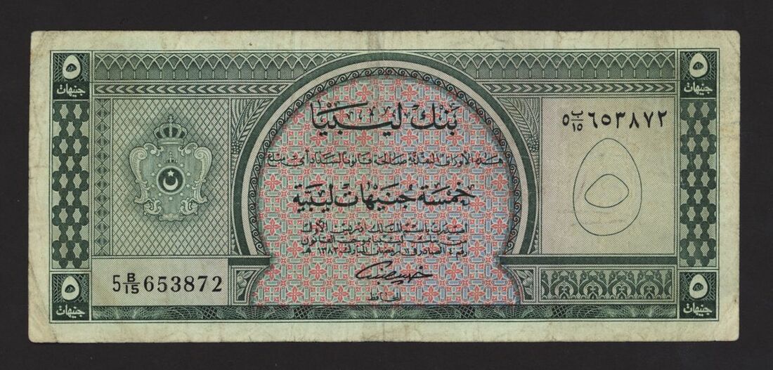Bank of Libya, £5, 5th February 1963, serial number 5 B/15 653872, (Pick 31a), fine, annotations