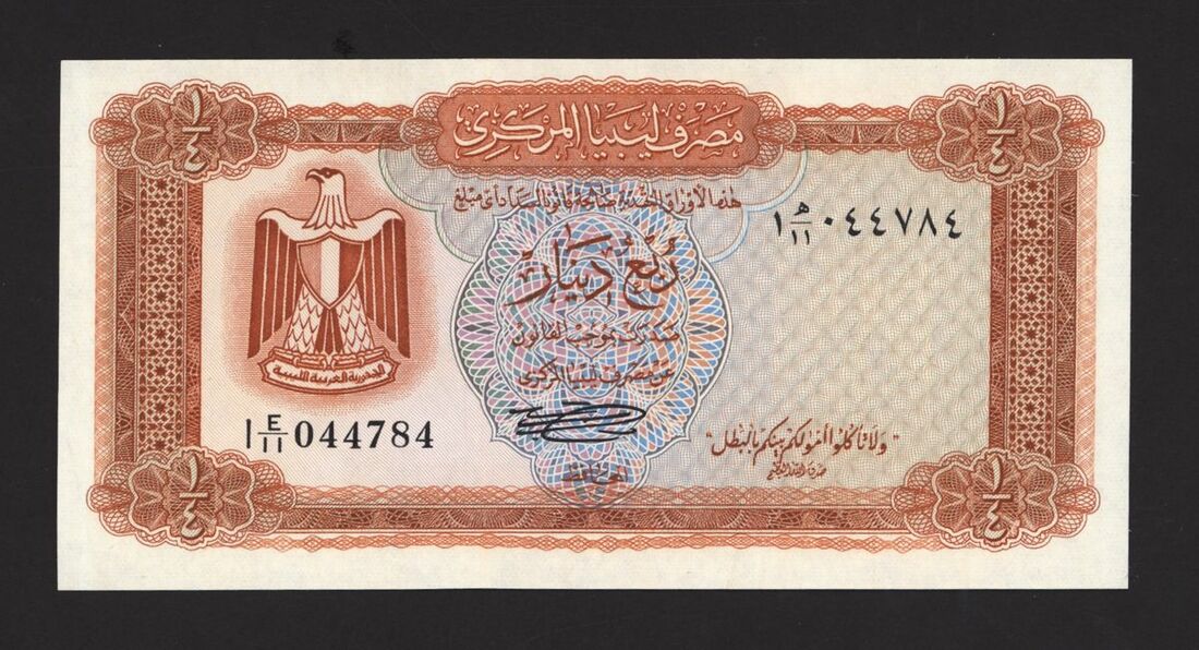 Central Bank of Libya, 1/4 dinar, ND (1972), serial number 1 E/11 044784, (Pick 33b), uncirculated