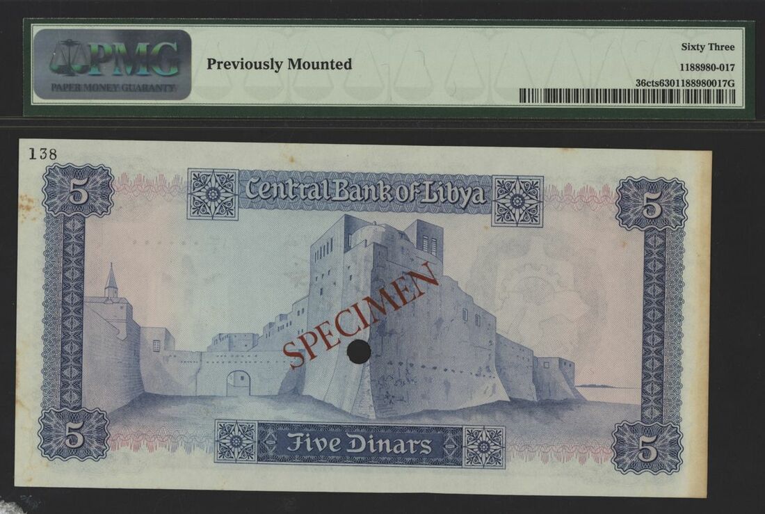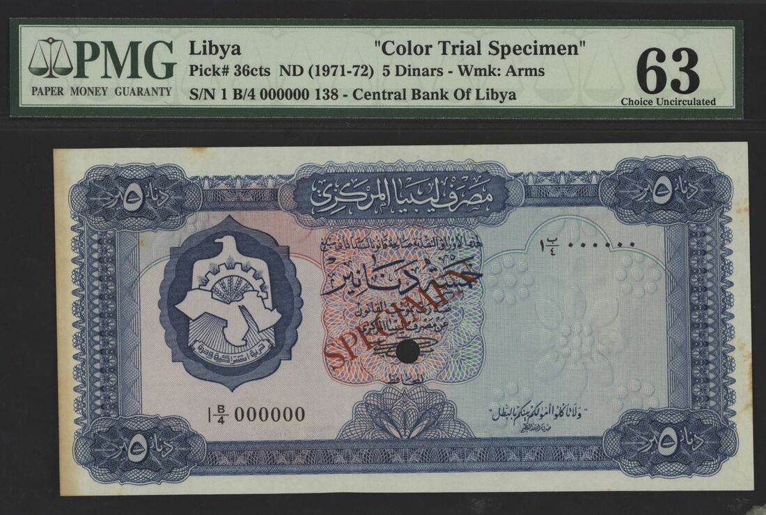Central Bank of Libya, colour trial specimen 5 dinars, ND (1971-72), serial number 1 B/4 000000 138, (Pick 36cts), in PMG holder 63 Choice Uncirculated, previously mounted