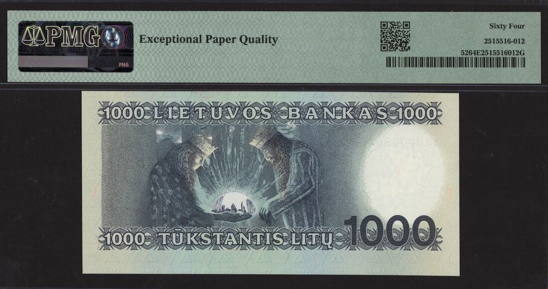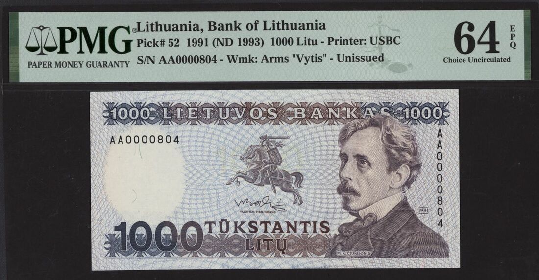 (x) Bank of Lithuania, 1000 litu, 1991 (ND 1993), serial number AA0000804, (Pick 52), in PMG holder 64 EPQ Choice Uncirculated
