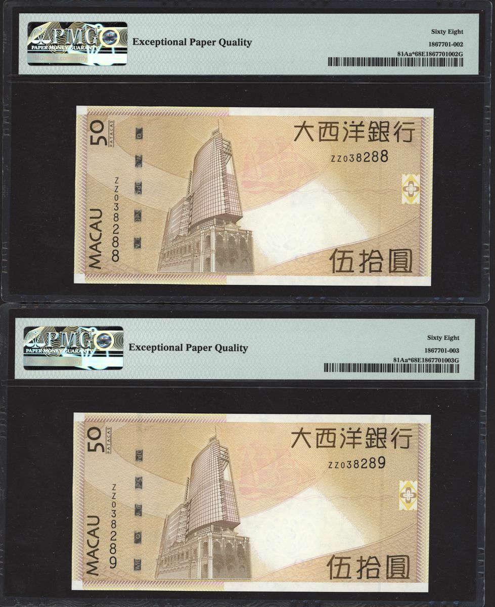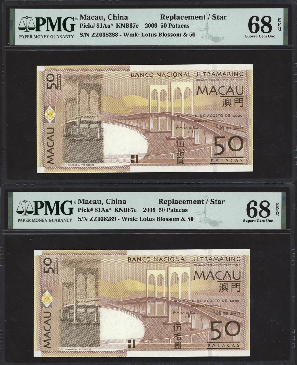 (x) Banco Nacional Ultramarino, Macau, consecutive pair of replacement 50 patacas, 2009, serial number ZZ038288-9 (Pick 81Aa*), both in PMG holders 68 EPQ Superb Gem Uncirculated (2 notes)