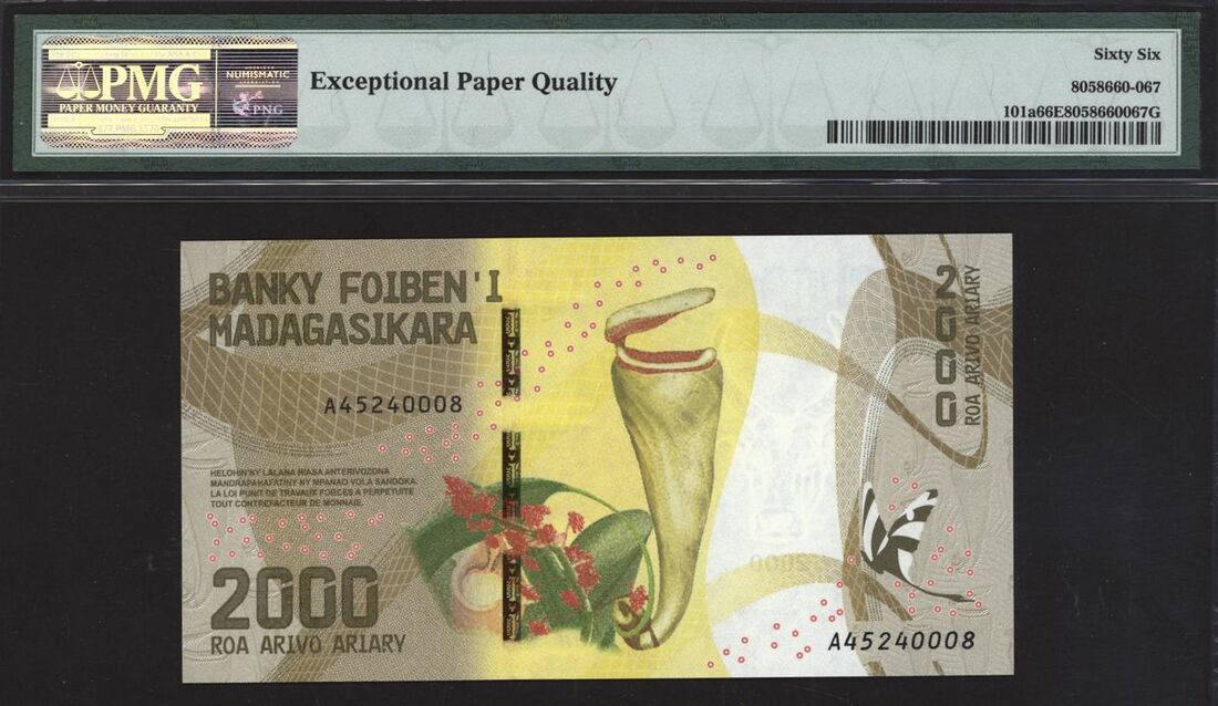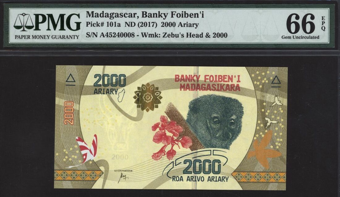 (x) Banky Foiben'i Madagasikara, Madagascar, 2000 ariary, ND (2017), serial number A45240008, (Pick 101a), in PMG holder 66 EPQ Gem Uncirculated