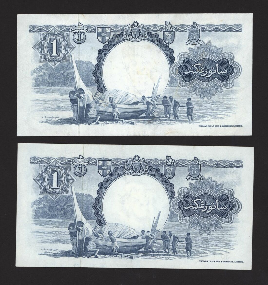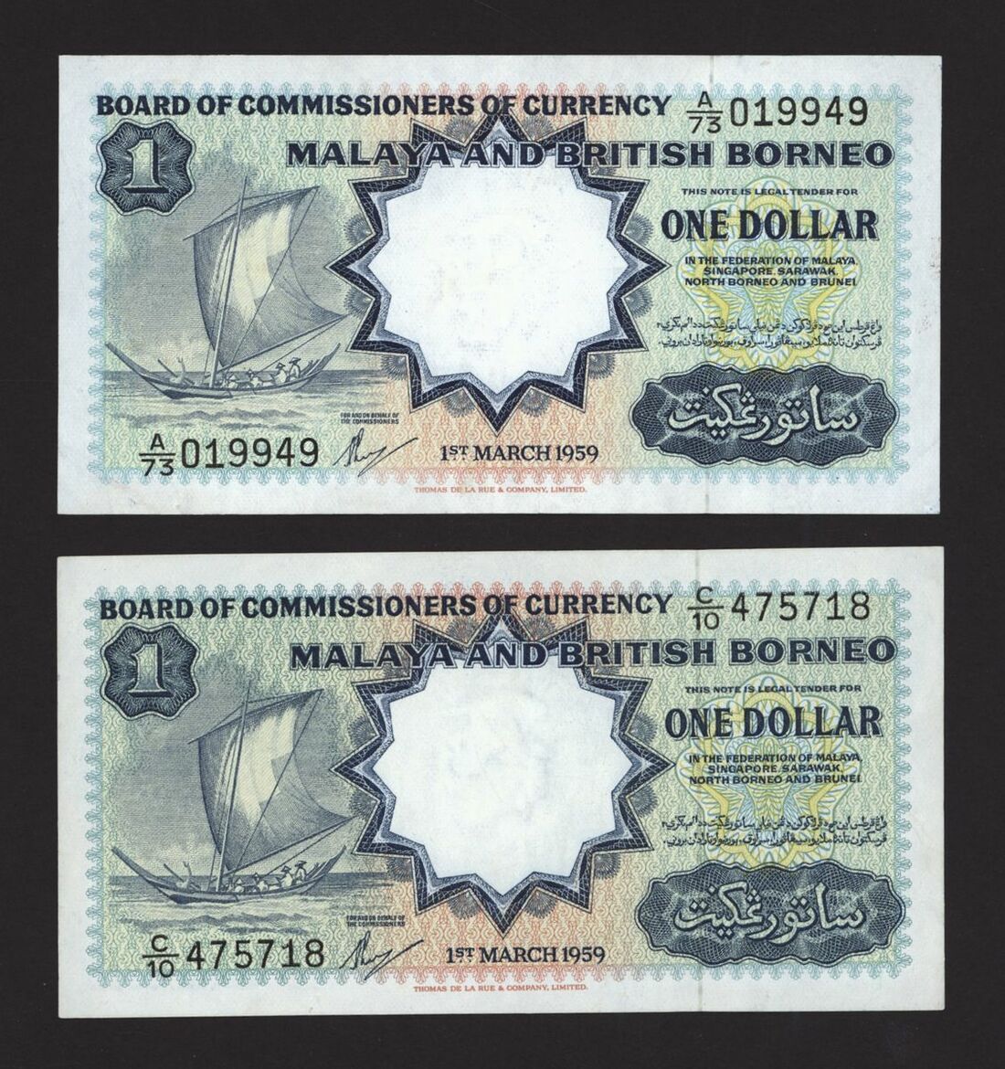 Board of Commissioners of Currency, Malaya & British Borneo, pair of 1 dollar, 1st March 1959, serial numbers A/73 019949, C/10 475718 (Pick 8A), uncirculated, extremely fine