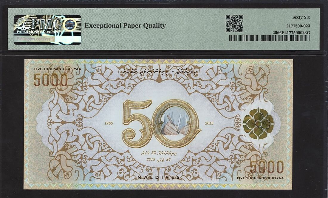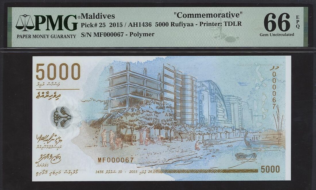 Maldives Monetary Authority, commemorative 5000 rufiyaa, 2015, serial number MF000067, (Pick 25), in PMG holder 66 EPQ Gem Uncirculated, including the presentational folder