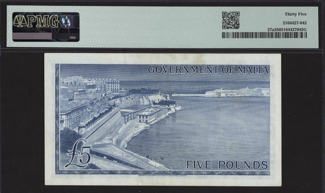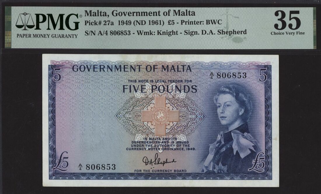(x) Government of Malta, £5, 1949 (ND 1961), serial number A/4 806853, (Pick 27a), in PMG holder 35 Choice Very Fine