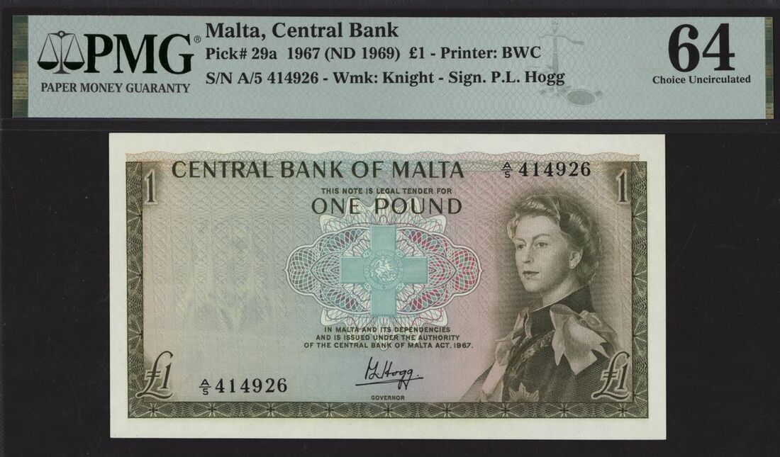 (x) Central Bank of Malta, £1, 1967 (ND 1969), serial number A/5 414926, (Pick 29a), in PMG holder 64 Choice Uncirculated