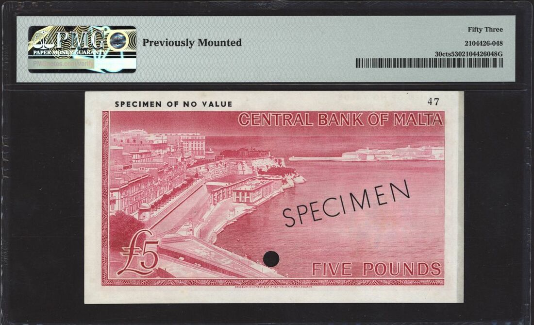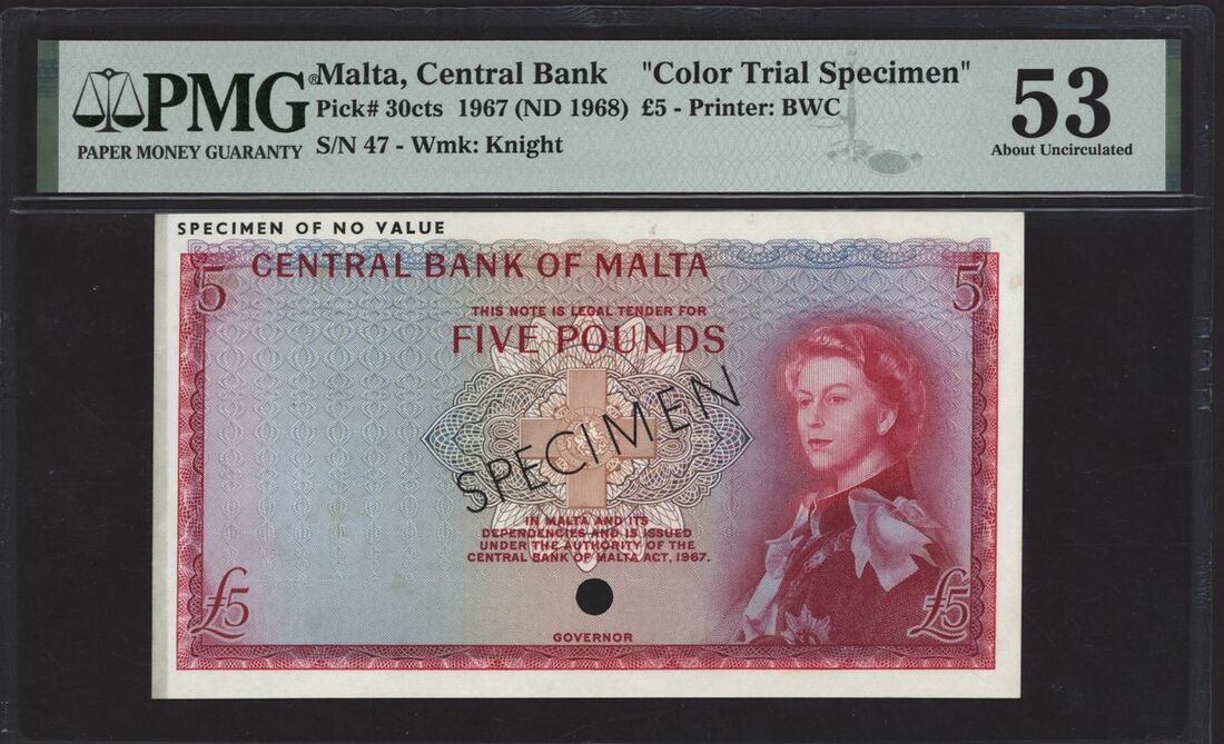 (x) Central Bank of Malta, colour trial specimen £5, 1967 (ND 1968), serial number 47, (Pick 30cts), in PMG holder 53 About Uncirculated, previously mounted