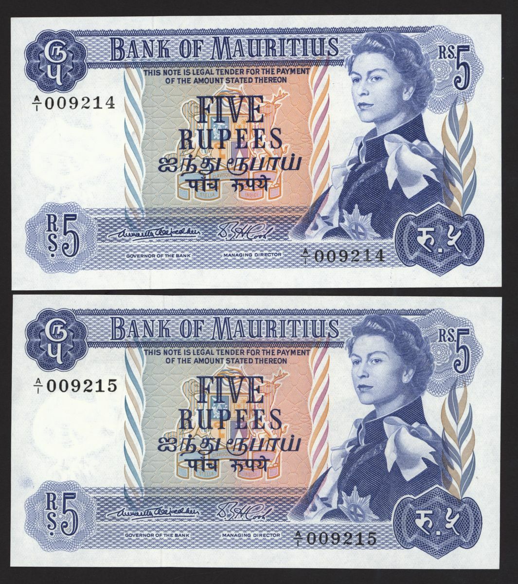 Bank of Mauritius, consecutive pair of 5 rupees, ND (1967), serial numbers A/1 009214-5, (Pick 30a), uncirculated