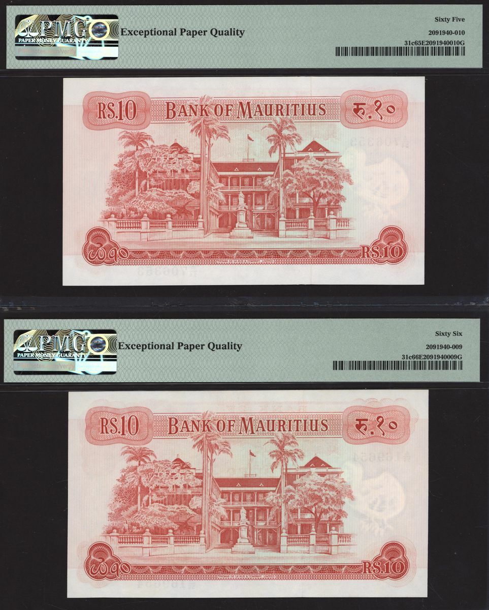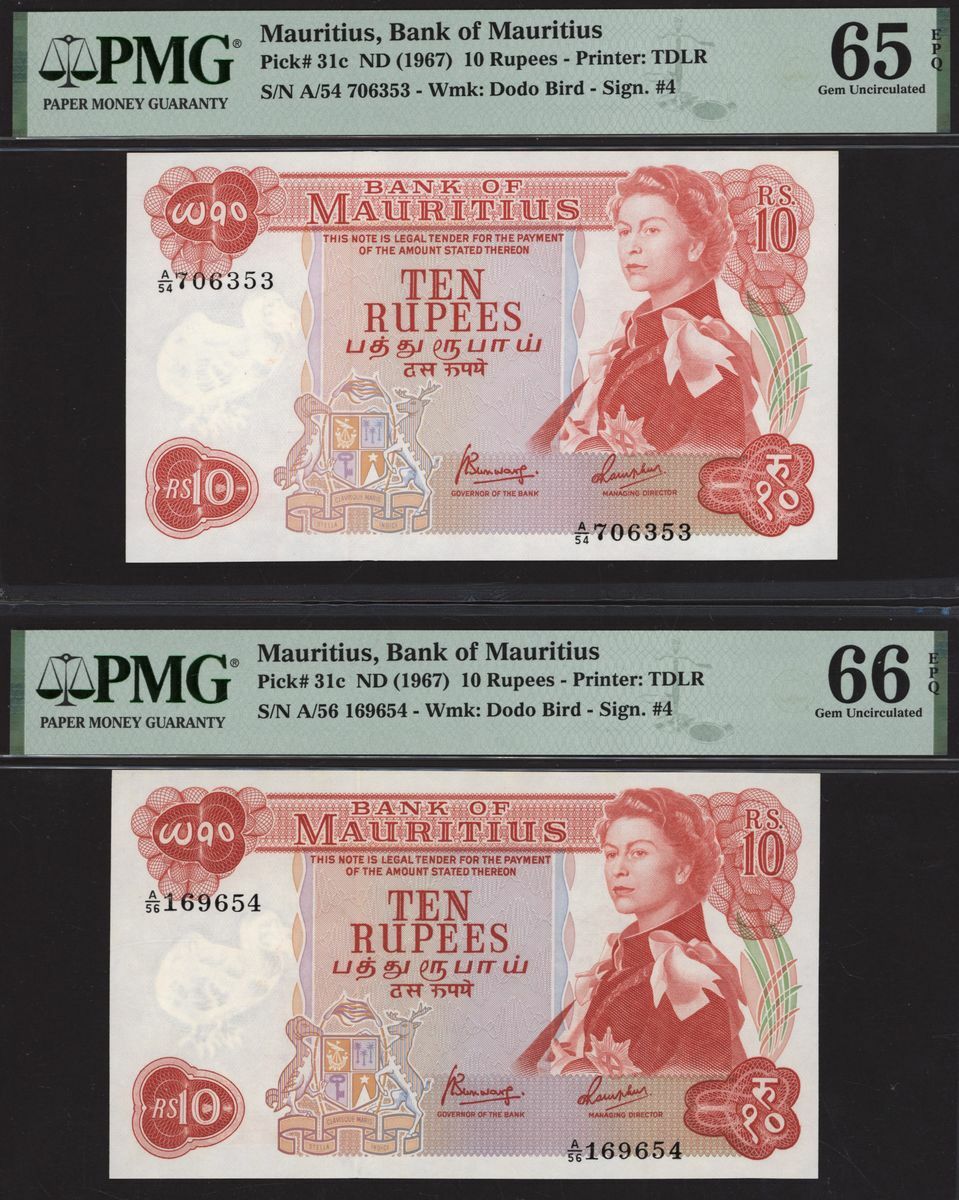 (x) Bank of Mauritius, pair of 10 rupees, ND (1967), serial numbers A/54 706353 / A/56 169654, (Pick 31c), in PMG holders 66 EPQ Gem Uncirculated, 65 EPQ Gem Uncirculated