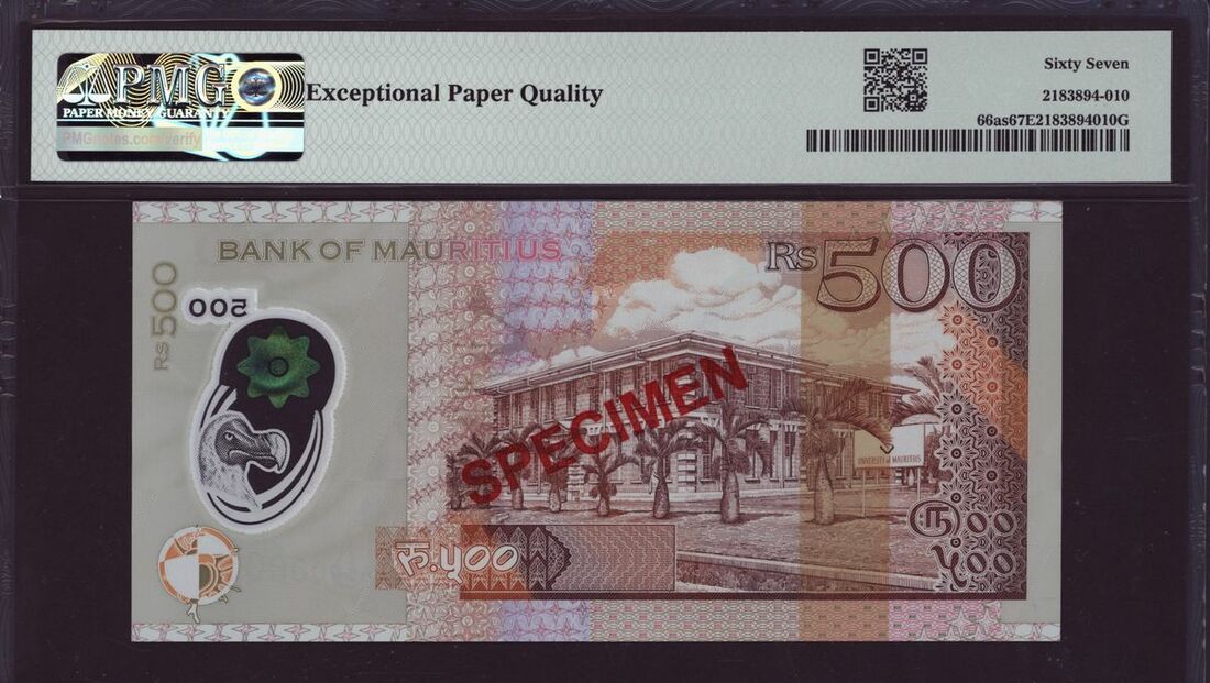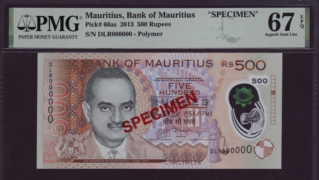 (x) Bank of Mauritius, [Top Pop] specimen 500 rupees, 2013, serial number DLR000000, (Pick 66as, BNB 434s), in PMG holder 67 EPQ Superb Gem Uncirculated, scarce and even more so in such a high grade