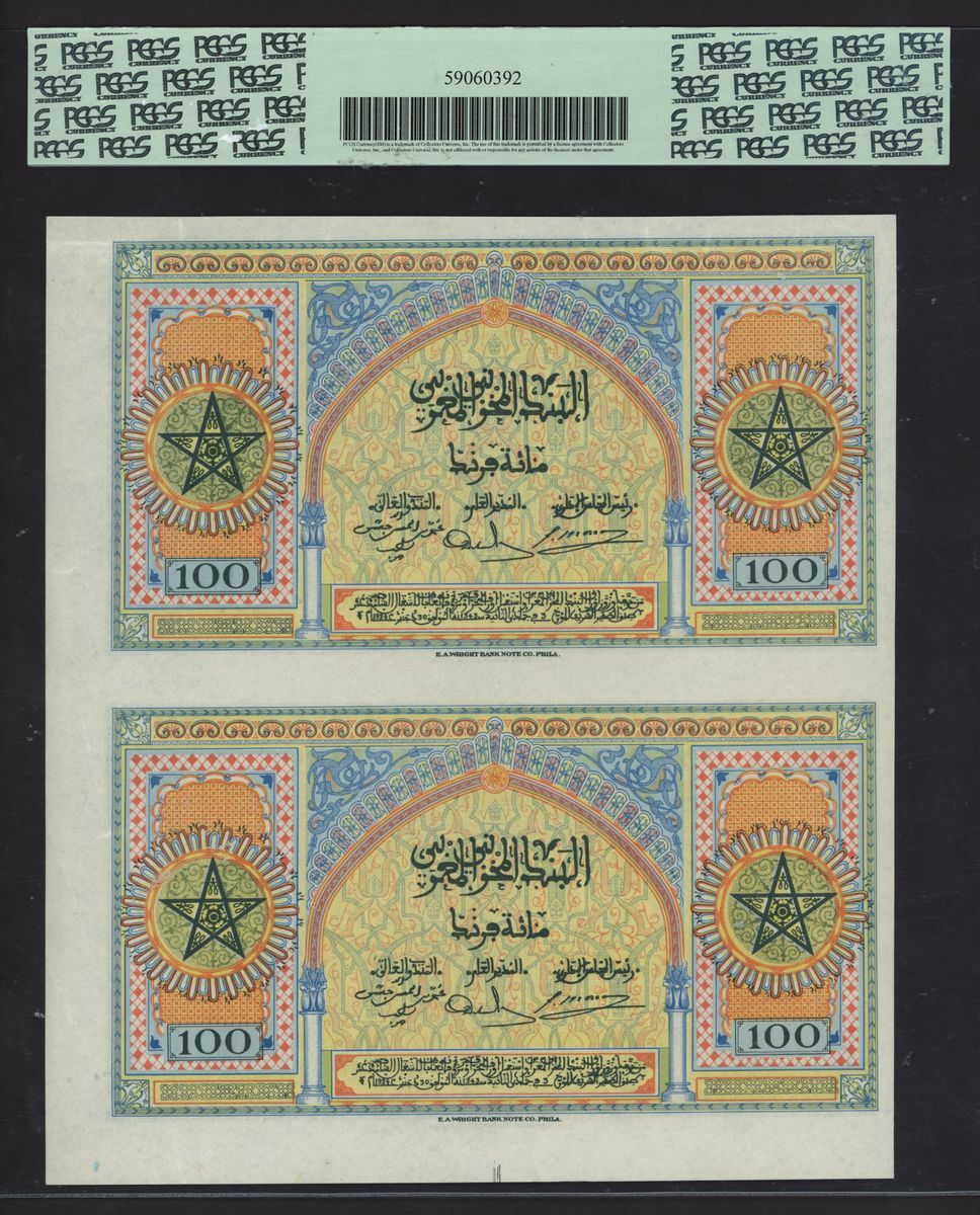 (x) Banque d'Etat du Maroc, Morocco, uncut pair of progressive proof 100 francs, 1943, (Pick 27), in PCGS holder 50 About New