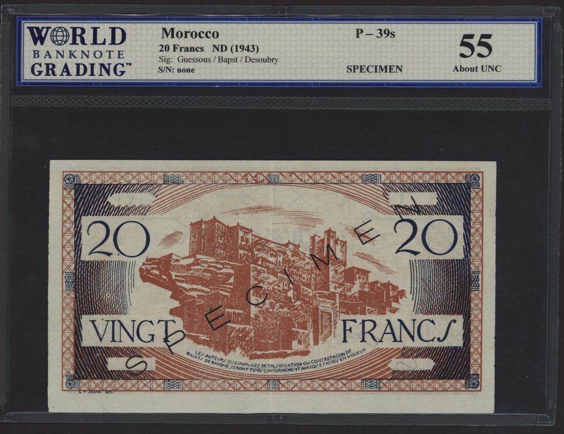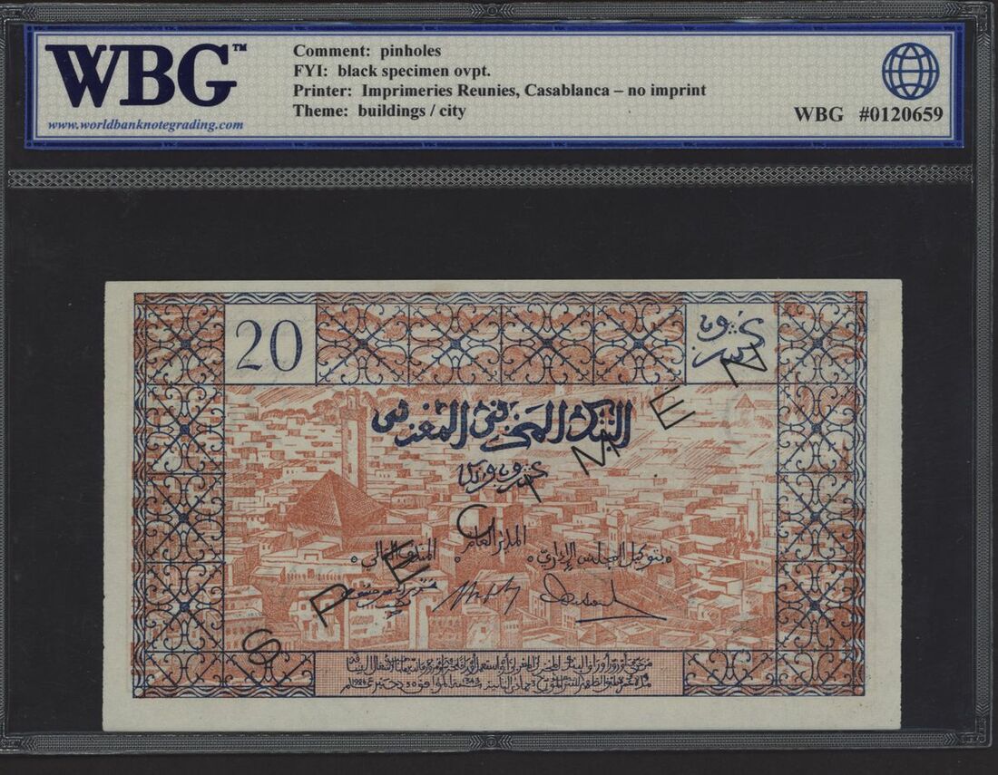 (x) Banque d'Etat du Maroc, Morocco, specimen 20 francs, ND (1943), (Pick 39s), in WBG holder 55 About Uncirculated, pinholes