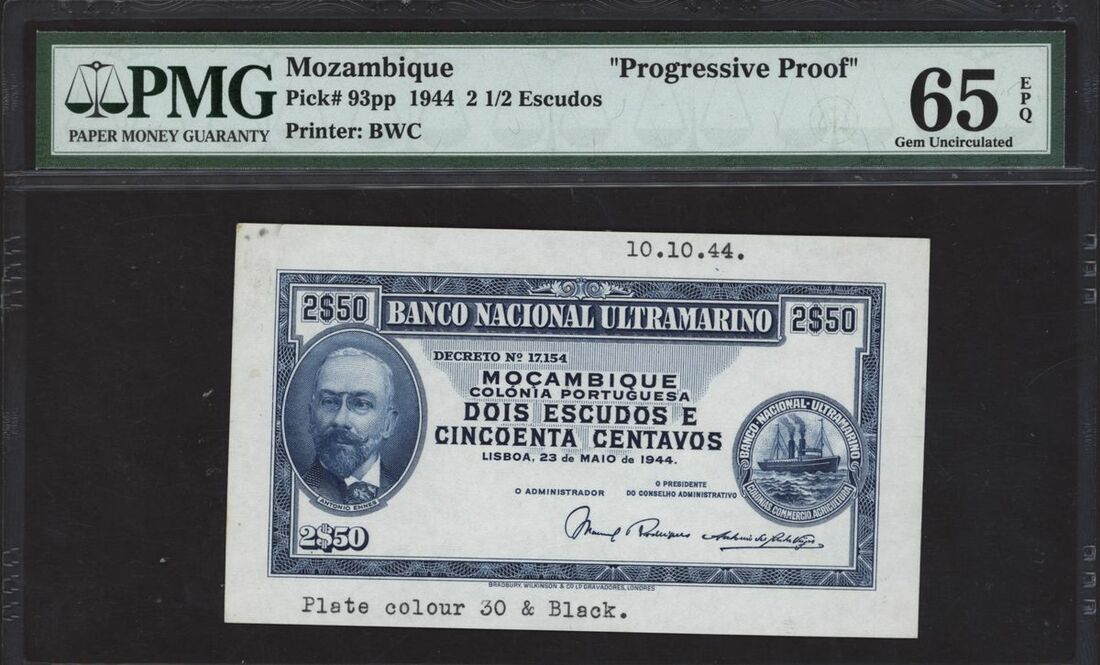 (x) Banco Nacional Ultramarino, Mozambique, progressive proof 2 1/2 escudos, 1944, (Pick 93pp), in PMG holder 65 EPQ Gem Uncirculated
