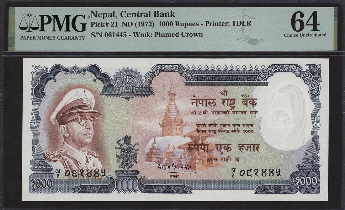(x) Central Bank of Nepal, 1000 rupees, ND (1972), serial number 061445, (Pick 21), in PMG holder 64 Choice Uncirculated