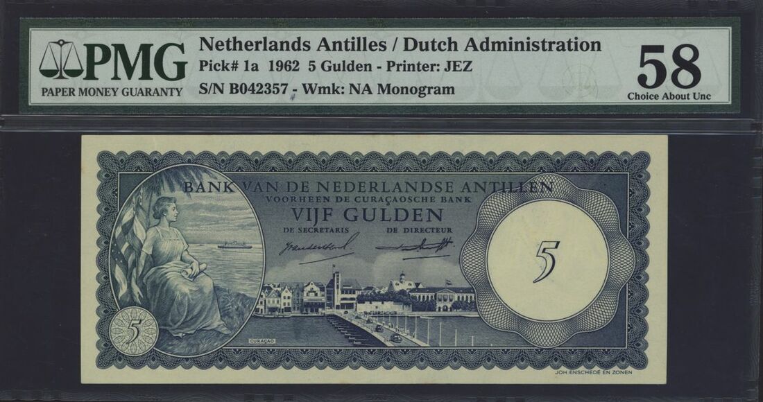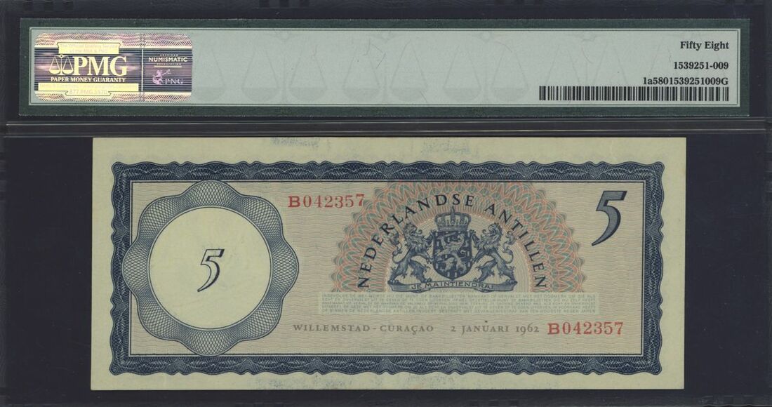 (x) Netherlands Antilles, 5 gulden, 1962, serial number B042357, (Pick 1a), in PMG holder 58 Choice About Uncirculated