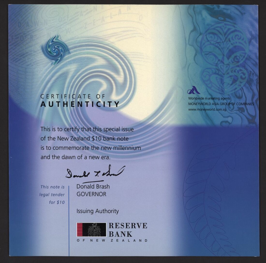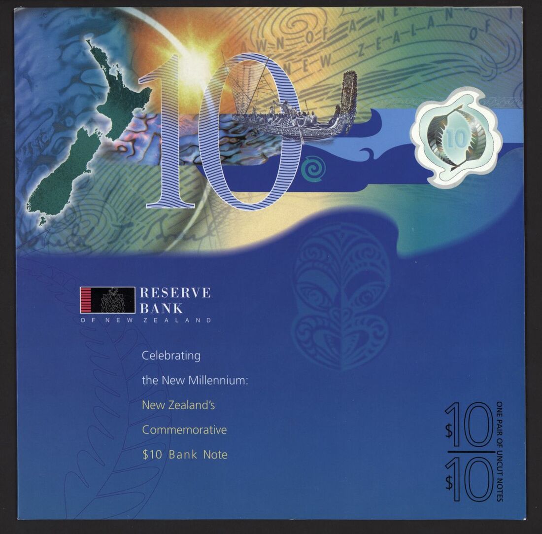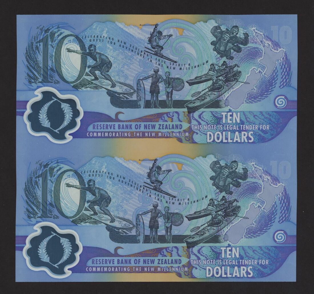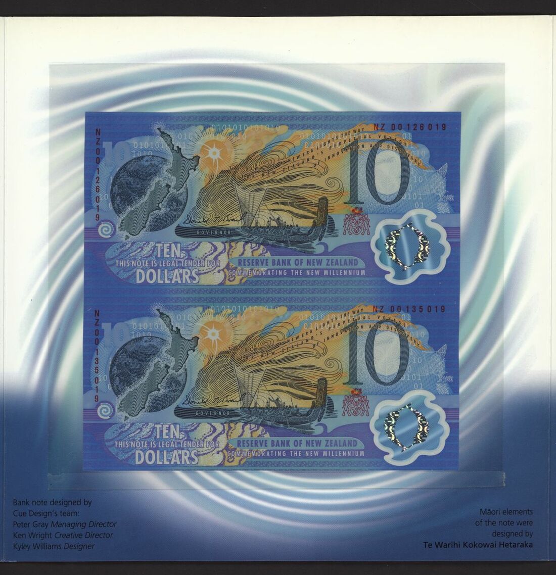 Reserve Bank of New Zealand, uncut pair of commemorative 10 dollars, 2000, serial numbers NZ00126019/35019, (Pick 190b), uncirculated, in presentation folder