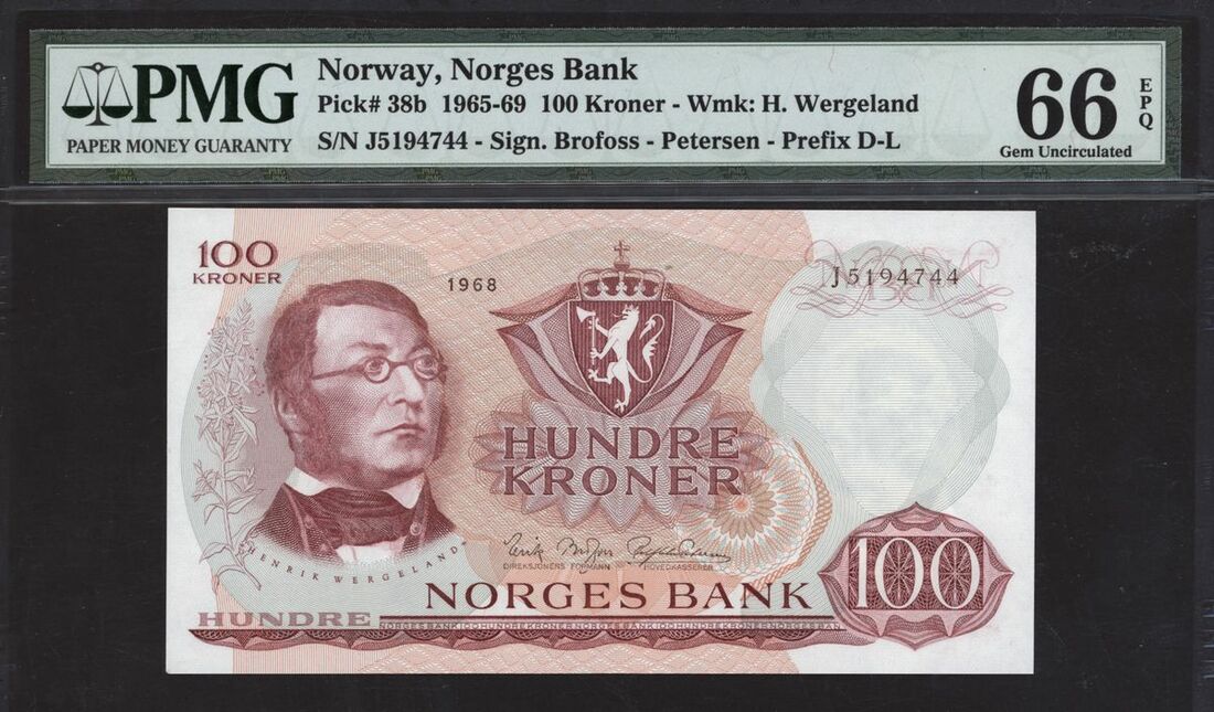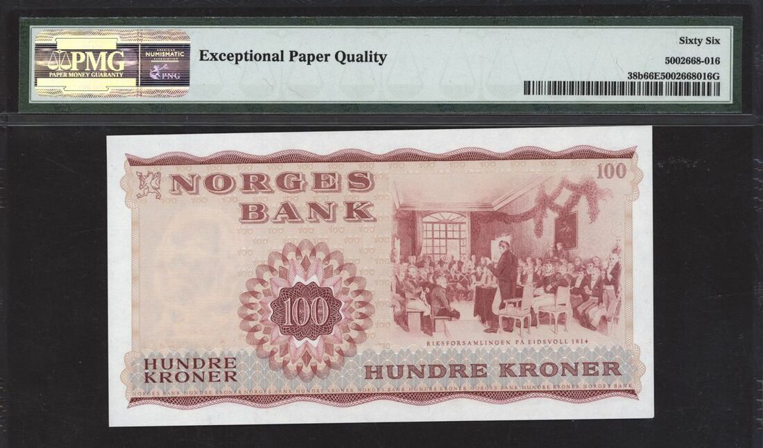 (x) Norges Bank, Norway, 100 kroner, 1968, serial number J5194744, (Pick 38b), in PMG holder 66 EPQ Gem Uncirculated