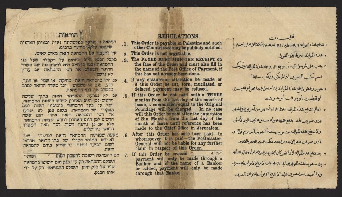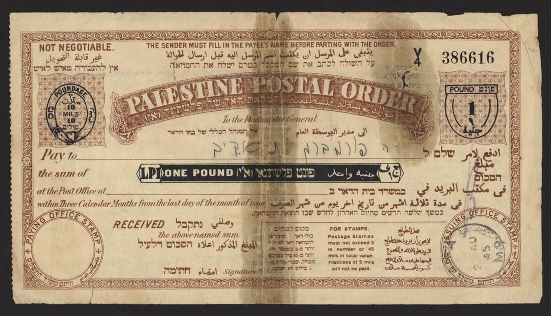 Palestine Postal Order, 1 pound, 1948, serial number V/4 386616, good