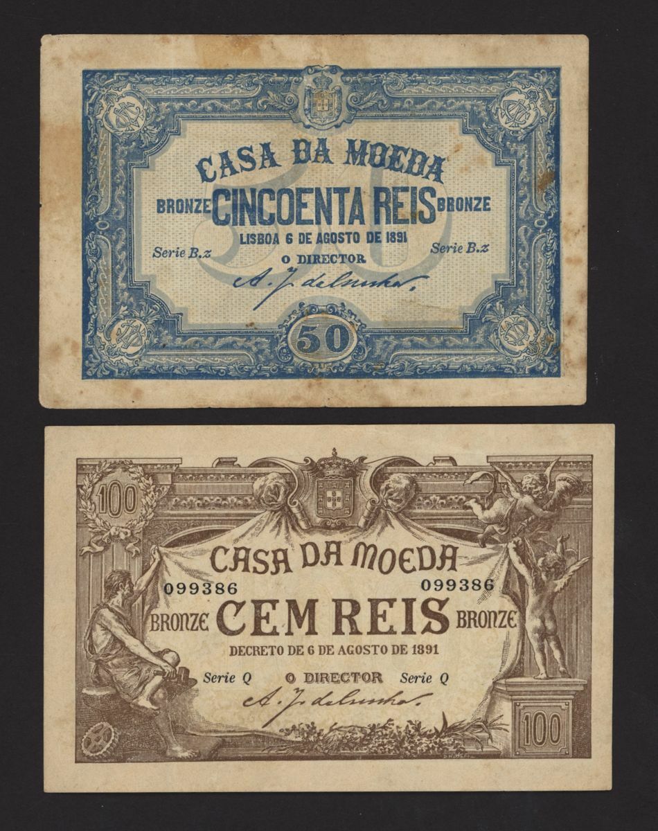 (x) Casa da Moeda, Portugal, 50 reis, 6 August 1891, blue and white, arms top centre, value in oval frame low centre, also 100 reis, serial number 099386, brown and white, arms top centre, Hephaestion at left