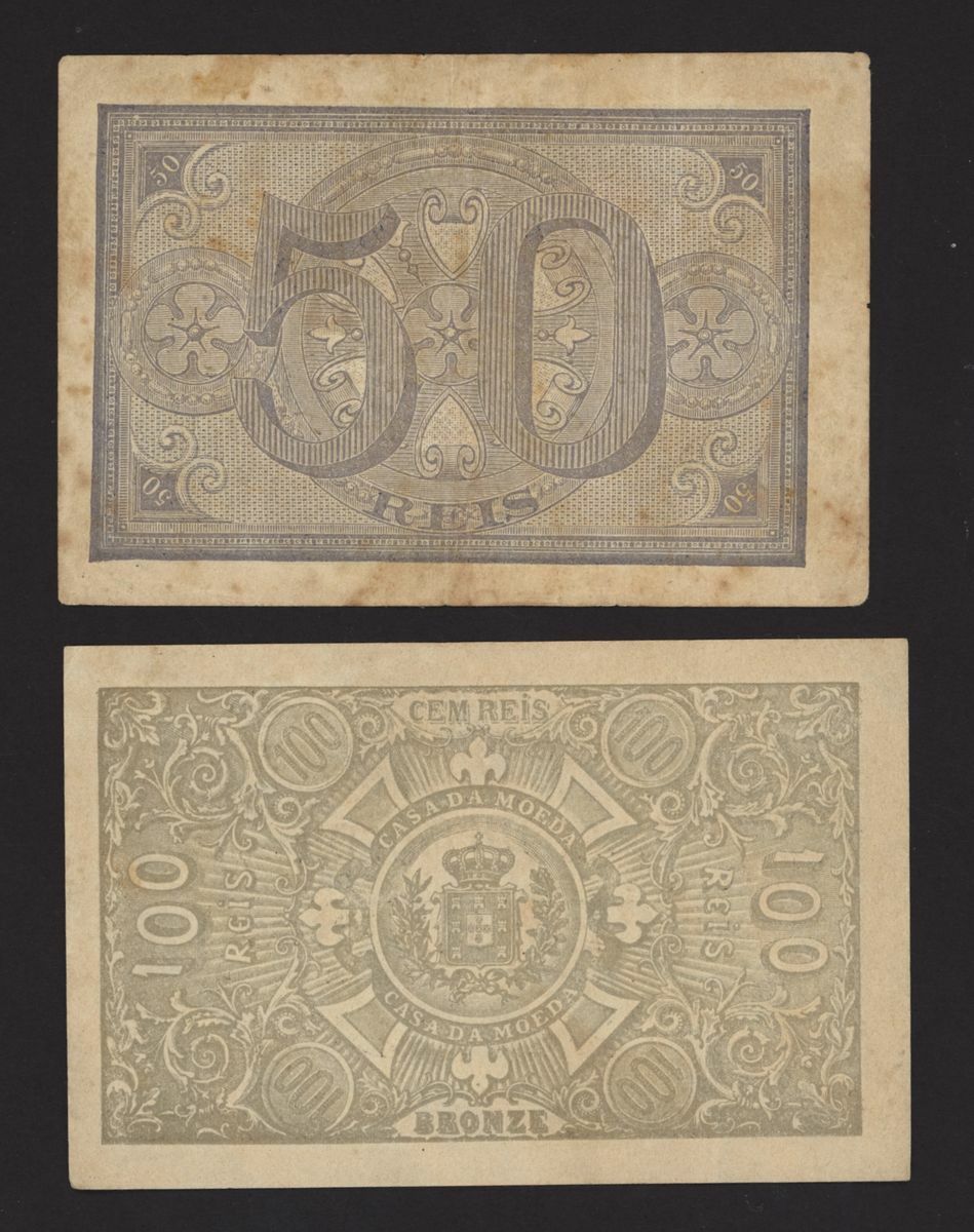 (Pick 87, 90), 100 reis extremely fine,50 reis very fine, some foxing on the 50 reis (2 notes)