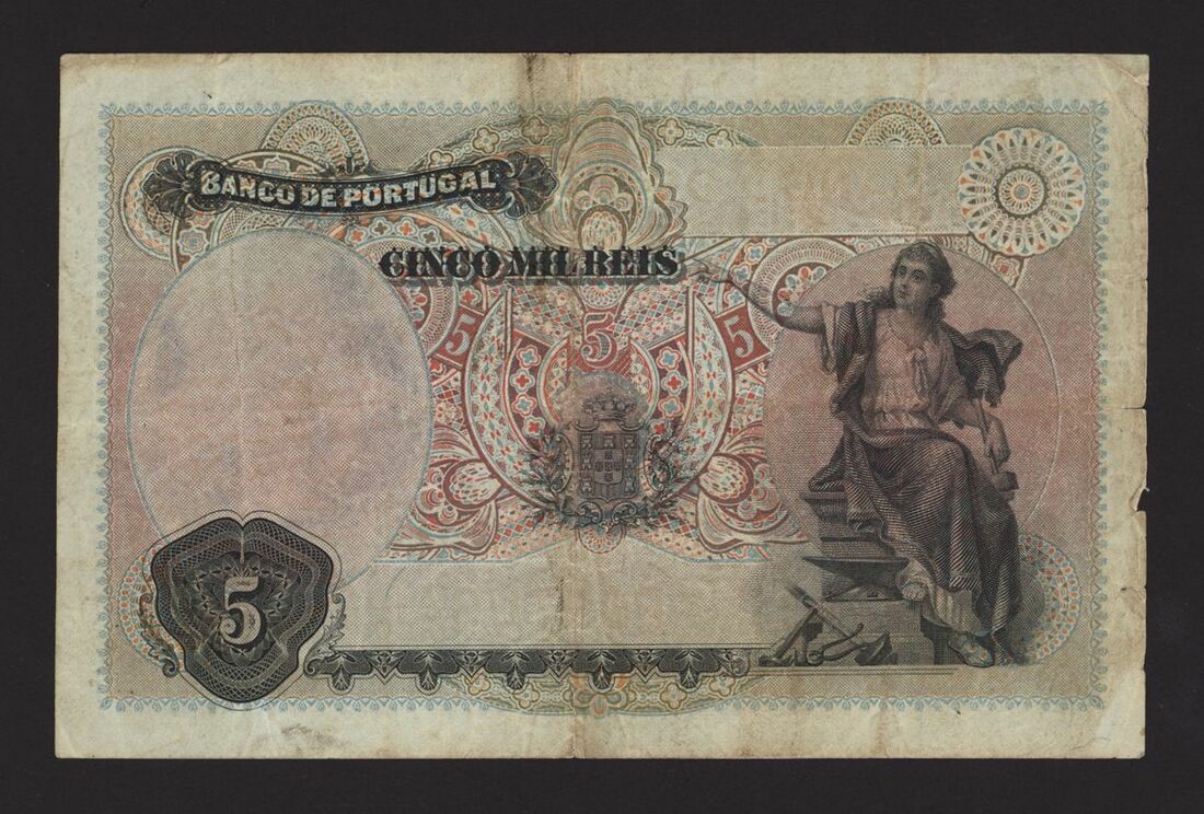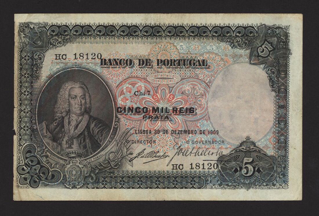 (x) Banco de Portugal, 5 Mil Reis, 30 December 1909, serial number HC 18120, black on blue and multicolour underprint, portrait Marquez de Pombal at left, reverse arms at centre, woman seated at right