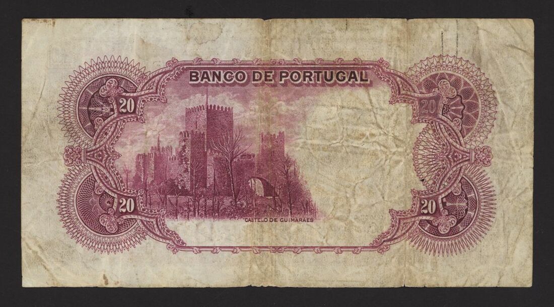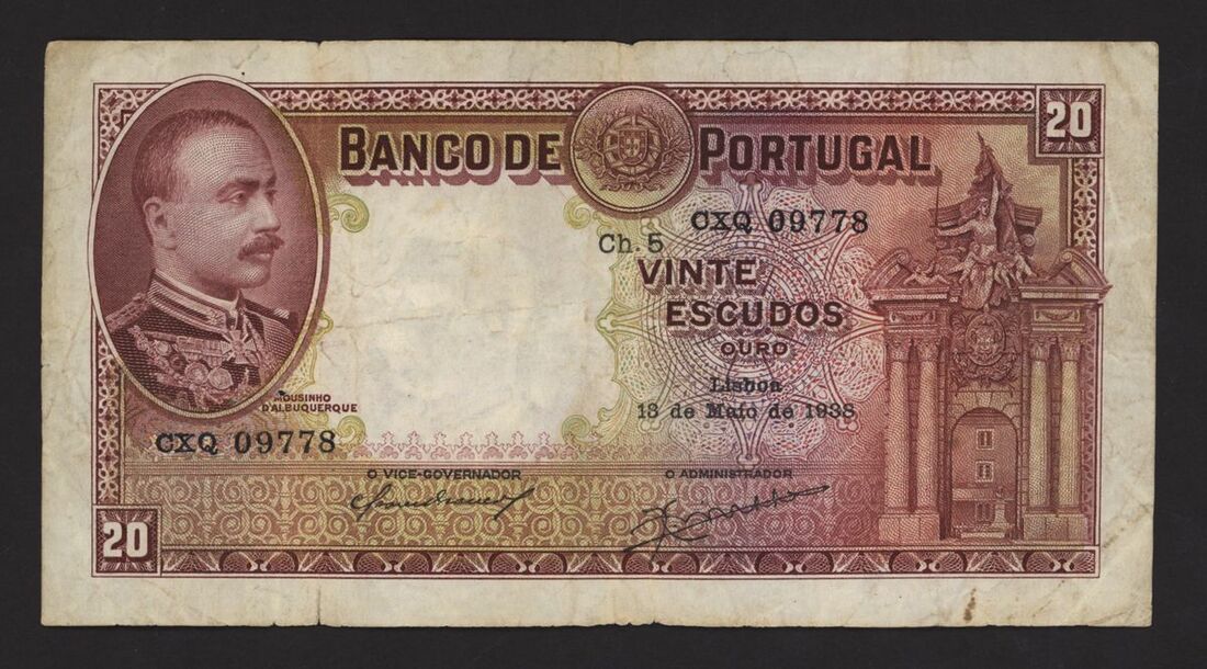 (x) Banco de Portugal, 20 escudos, 18 May 1938, serial number CXQ 09778, purple and pale green, M.de Albuquerque at top left, arms top centre, monument at right, reverse violet, Guimaeres Castle