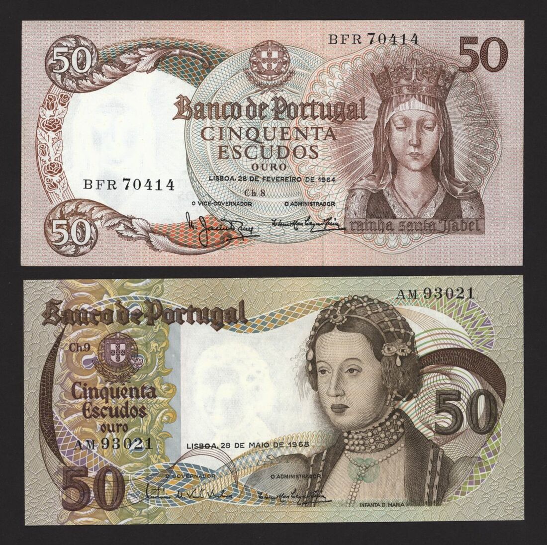 (x) Banco de Portugal, 50 escudos (2), 1964, 1968, Ch. 8, 9, brown and multi-coloured, Queen Isabella at right