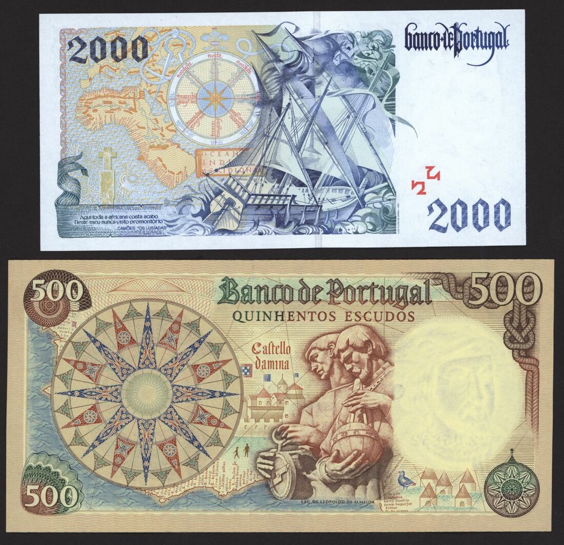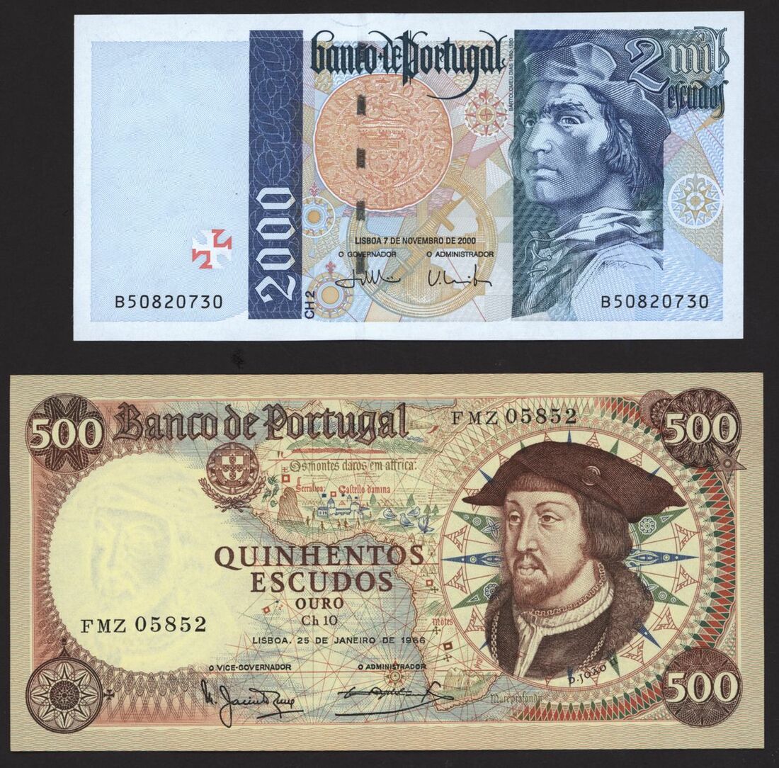 (x) Banco de Portugal, 500 escudos, 1966, serial number FMZ 05852, 2000 escudos, 2000, serial number B50820730, (Pick 170a, 189d), 500 escudos uncirculated, 2000 escudos about uncirculated