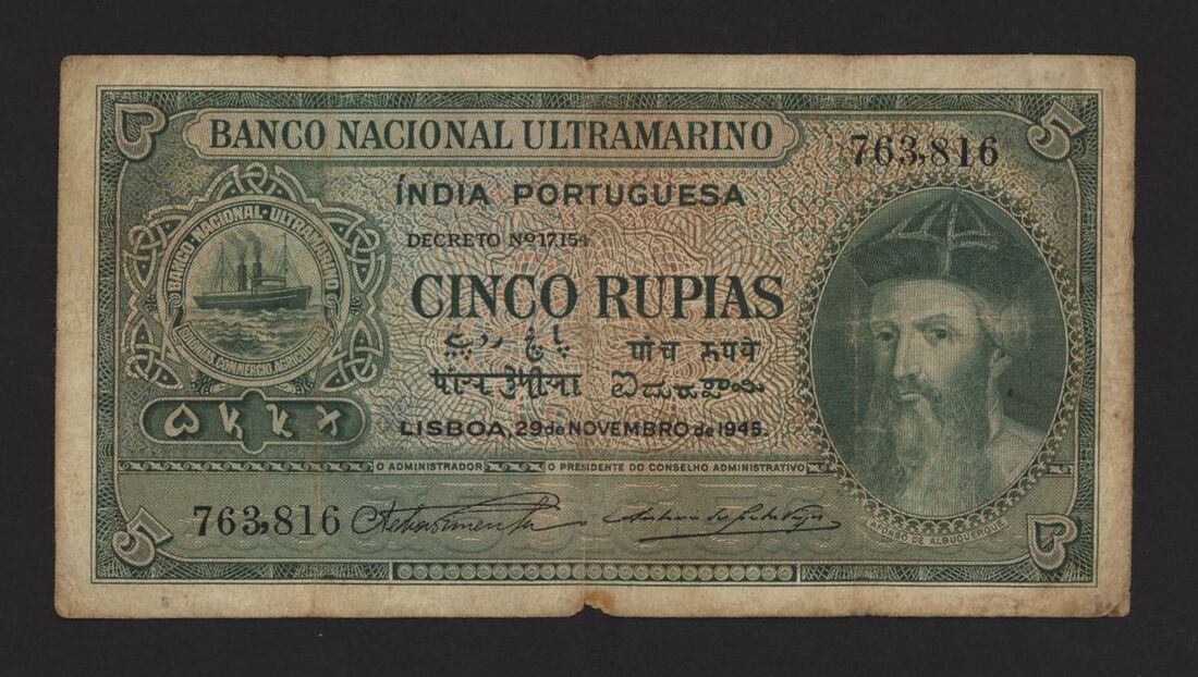 Banco Nacional Ultramarino, Portuguese India, 5 rupias, 1945, serial number 763816, (Pick 35), very good