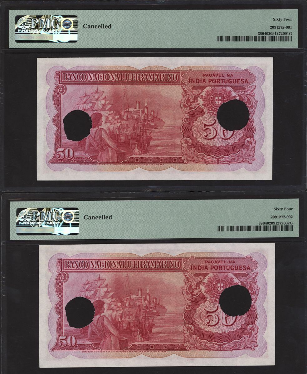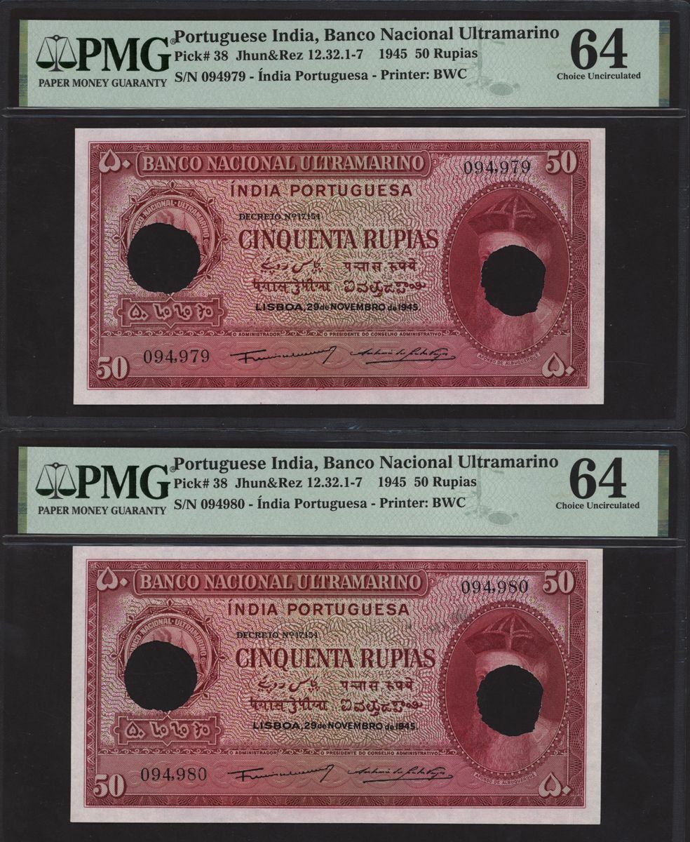 (x) Banco Nacional Ultramarino, Portuguese India, consecutive pair of cancelled 50 rupias, 1945, serial number 094979, (Pick 38), in PMG holders 64 Choice Uncirculated