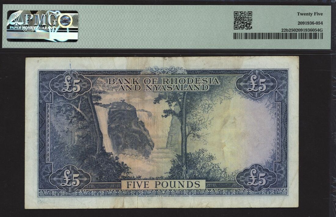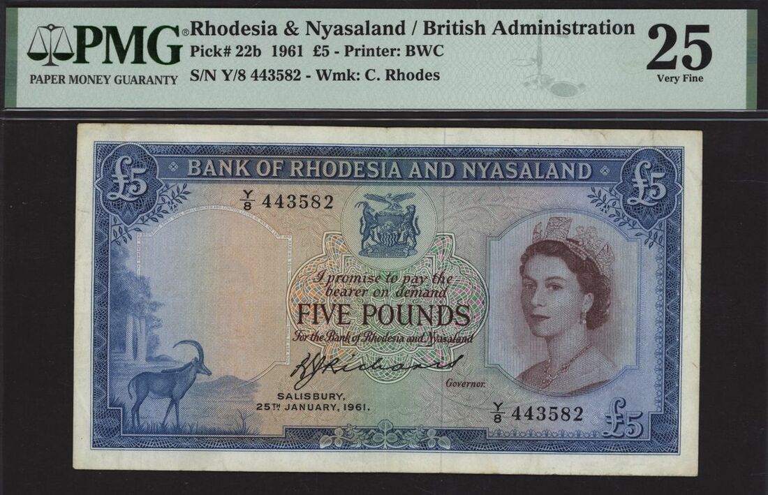 (x) Bank of Rhodesia and Nyasaland, £5, 1961, serial number Y/8 443582, (Pick 22b), in PMG 25 Very Fine