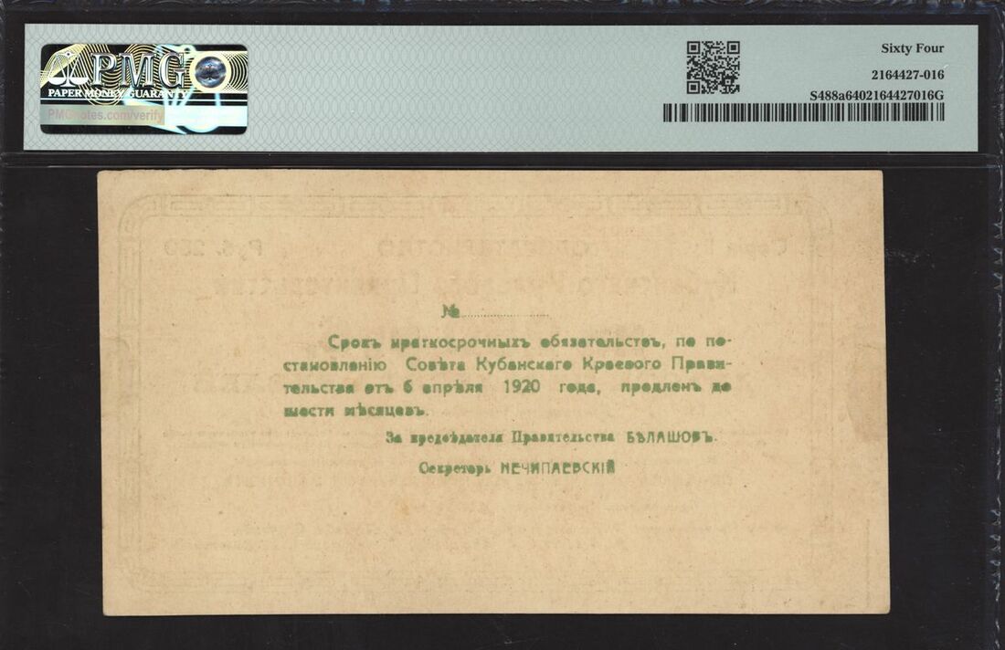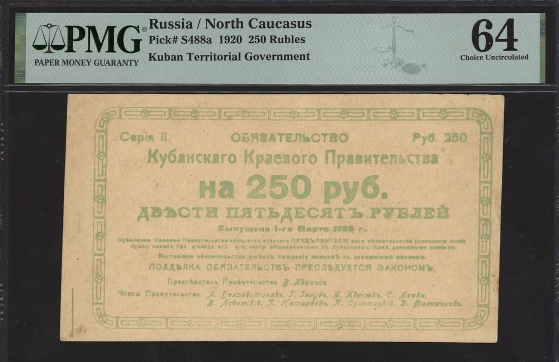 Kuban Territorial Government, Russia / North Caucasus, [Top Pop] 250 rubles, 1920, (Pick S488a), in PMG holder 64 Choice Uncirculated