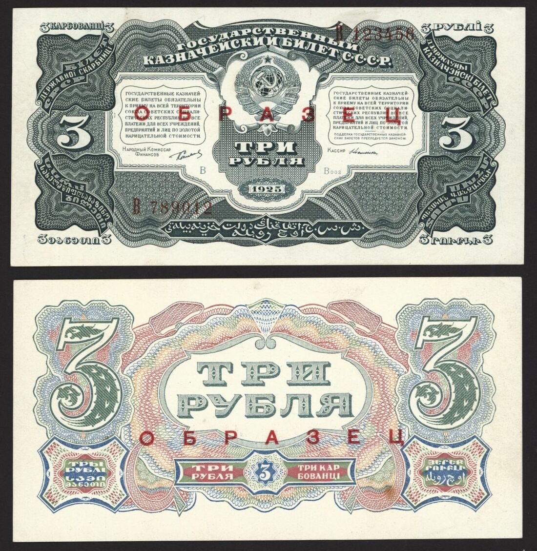 State Currency Note, Russia, pair of obverse and reverse specimen 3 rubles, 1925, serial number 789012 (Pick 189s), extremely fine