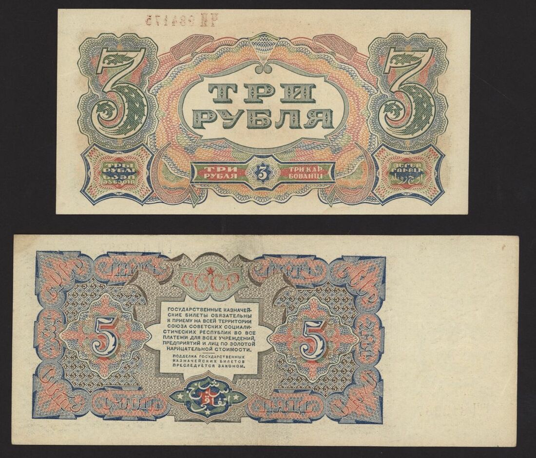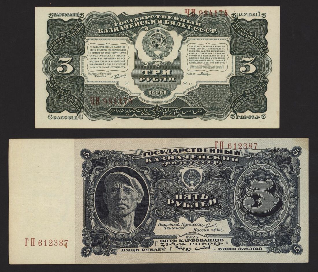 State Currency Note, Russia, 3 and 5 rubles, 1925, serial numbers 984174, 612387, (Pick 189, 190), about uncirculated (2 notes)