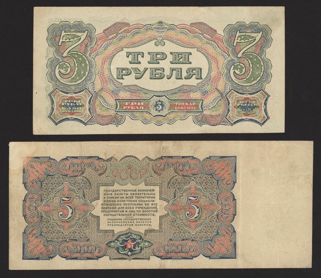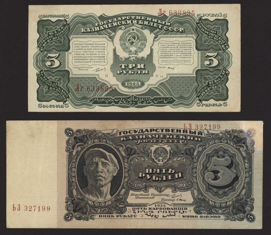 State Currency Note, Russia, 3 and 5 rubles, 1925, serial numbers 639895, 327199, (Pick 189, 190), 3 rubles about uncirculated, 5 rubles very fine (2 notes)