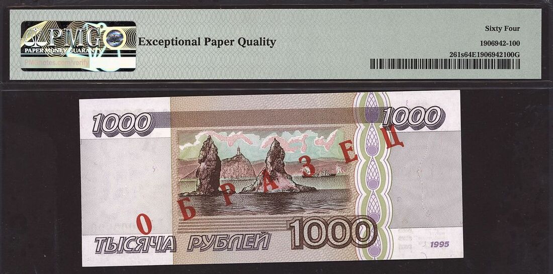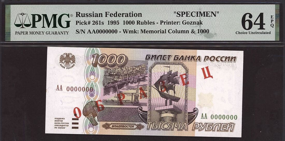 (x) Bank of Russia, specimen 1000 rubles, 1995, serial number AA0000000, (Pick 261s), in PMG holder 64 EPQ Choice Uncirculated, scarce