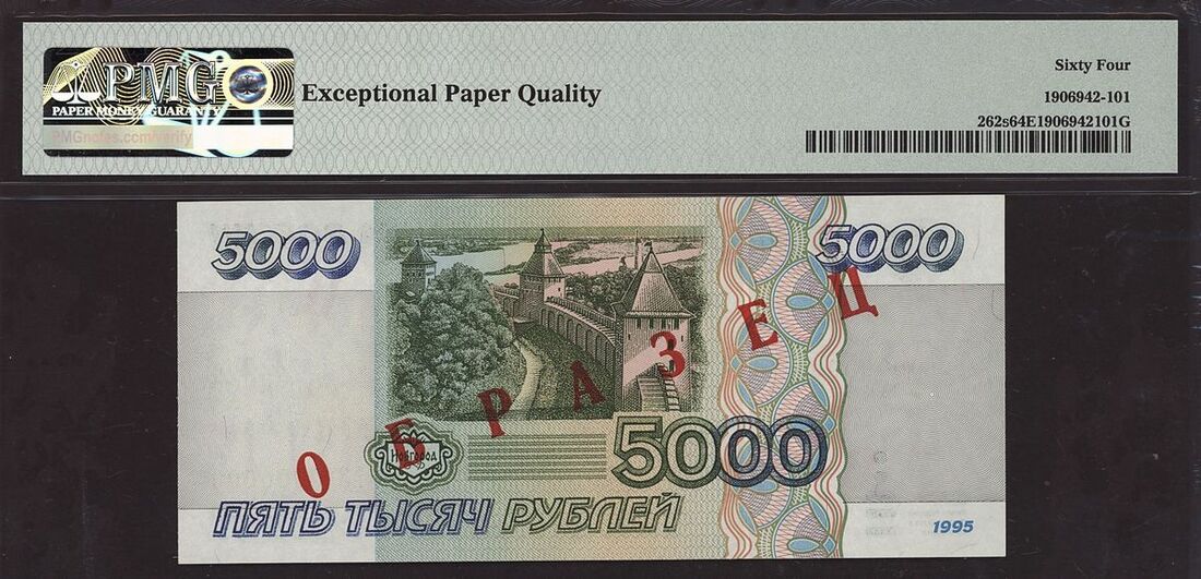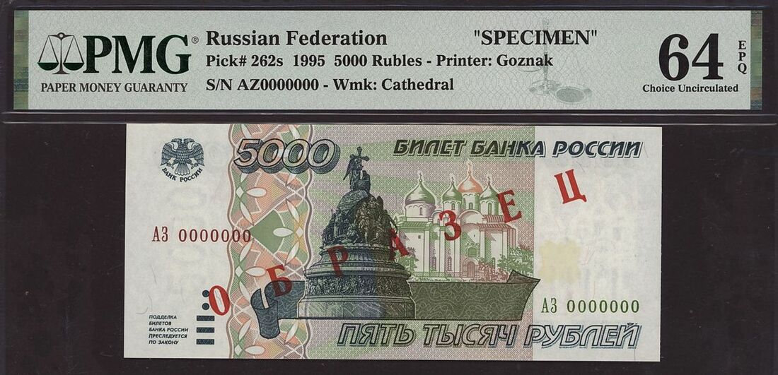 (x) Bank of Russia, specimen 5000 rubles, 1995, serial number AZ0000000, (Pick 262s), in PMG holder 64 EPQ Choice Uncirculated