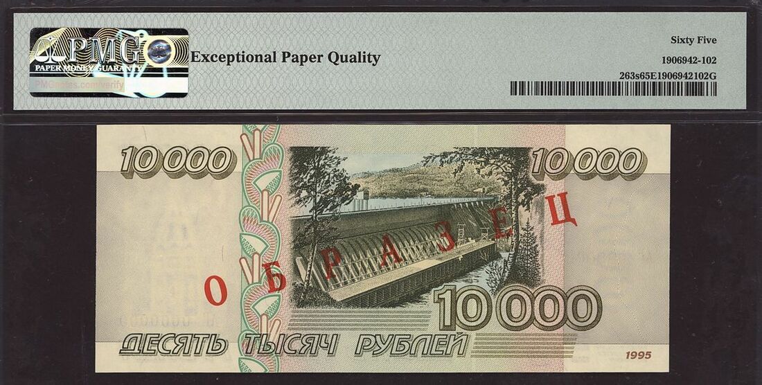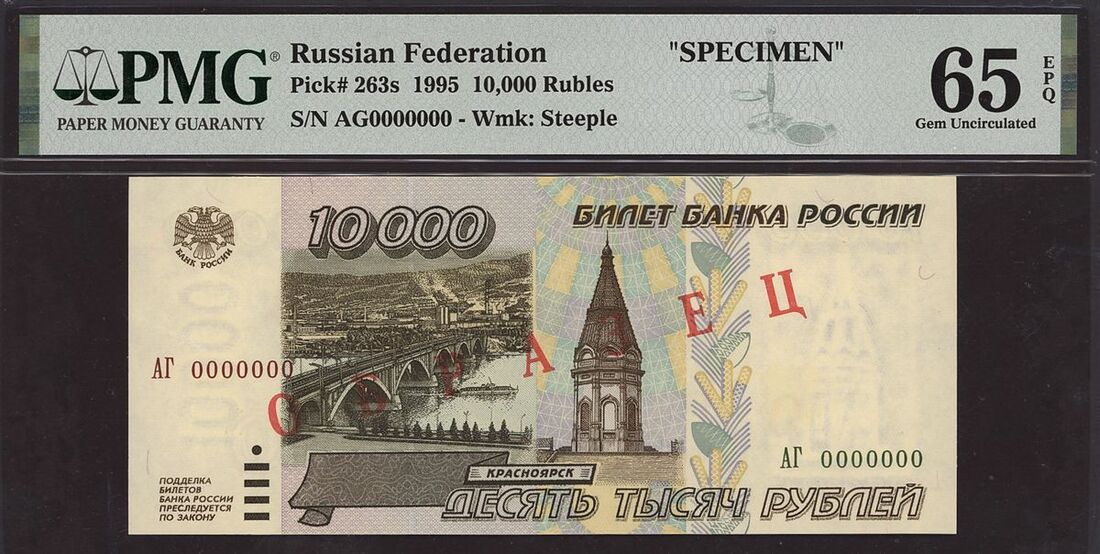 (x) Bank of Russia, specimen 10,000 rubles, 1995, serial number AG0000000, (Pick 263s), in PMG holder 65 EPQ Gem Uncirculated, only 1 note in a higher grade on PMG Census