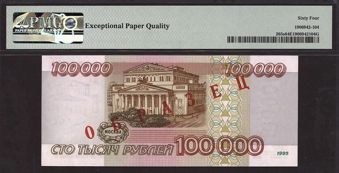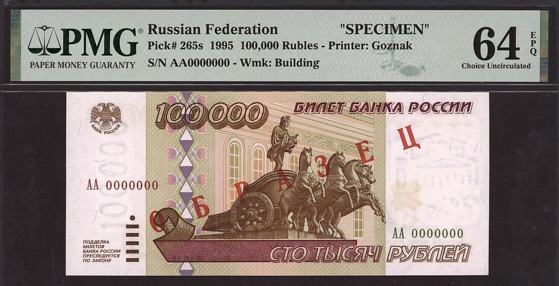(x) Bank of Russia, specimen 100,000 rubles, 1995, serial number AA0000000, (Pick 265s), in PMG holder 64 EPQ Choice Uncirculated