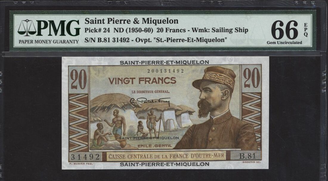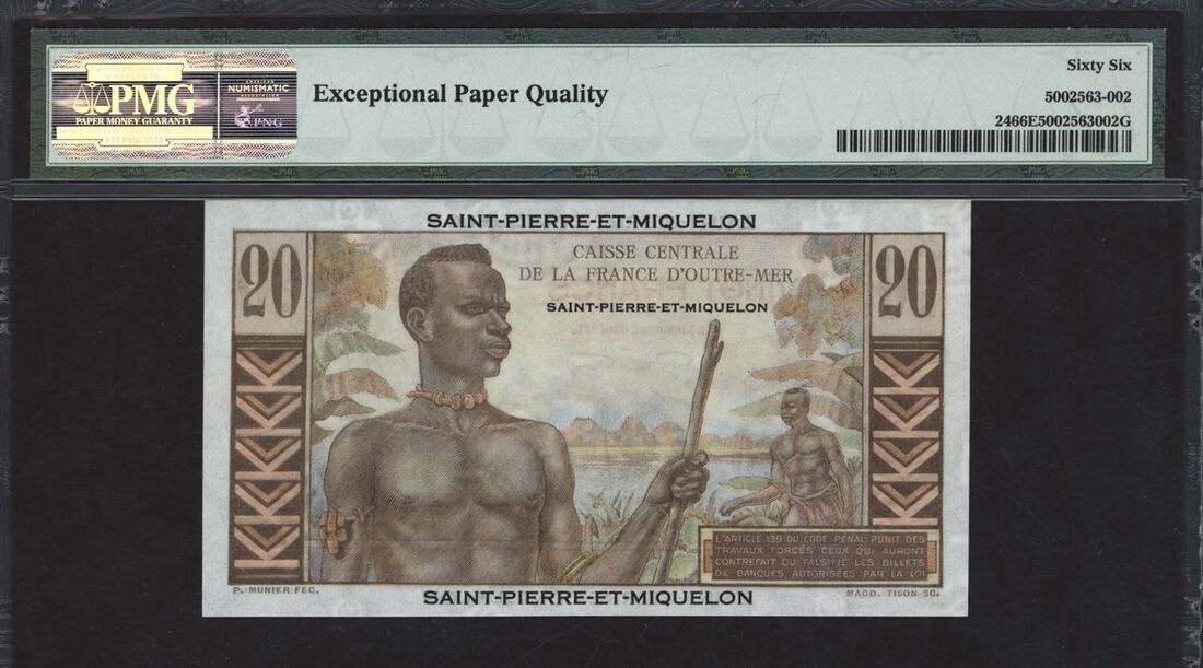 (x) Caisse Centrale de la France d'Outre-Mer, Saint Pierre & Miquelon, 20 francs, ND (1950-60), serial number B.81 31492, (Pick 24), in PMG holder 66 EPQ Gem Uncirculated