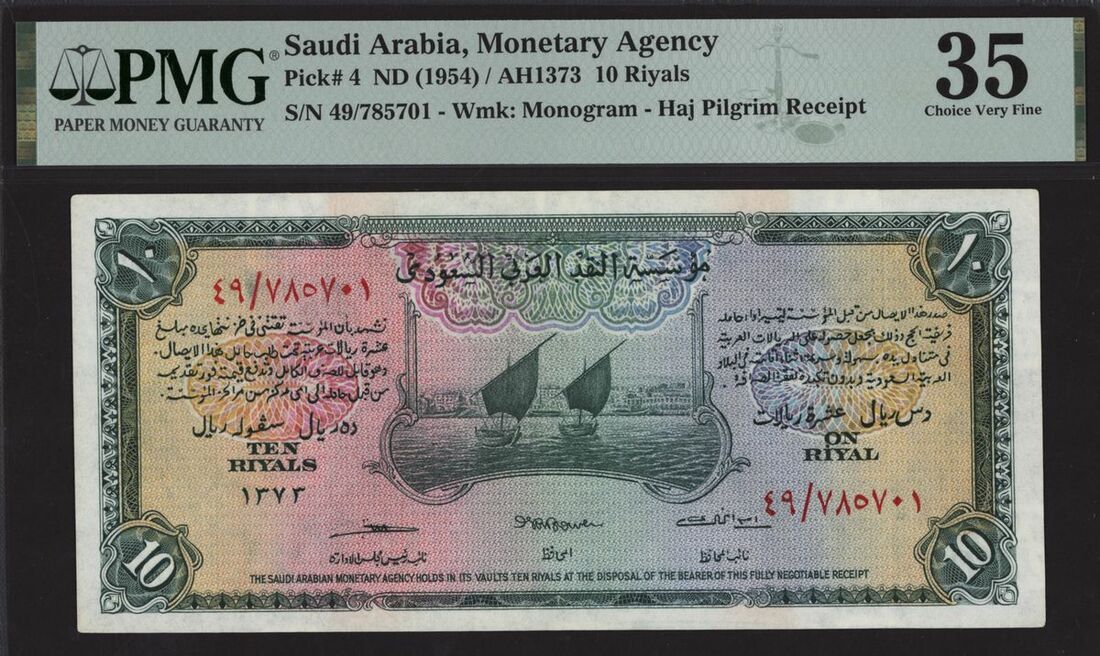 (x) Saudi Arabian Monetary Agency, Saudi Arabia, 10 riyals, ND (1954), serial number 49/785701, (Pick 4), in PMG holder 35 Choice Very Fine