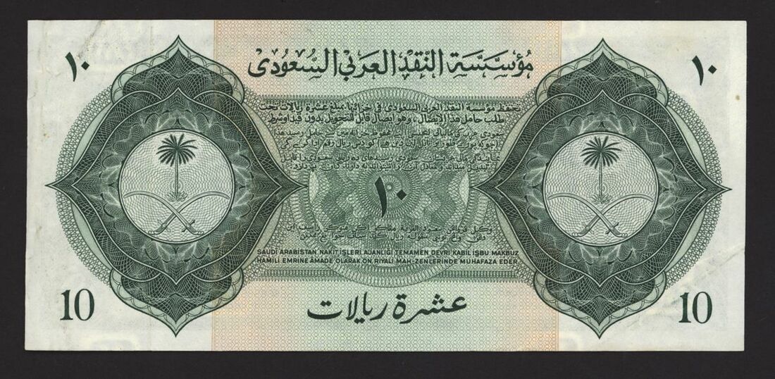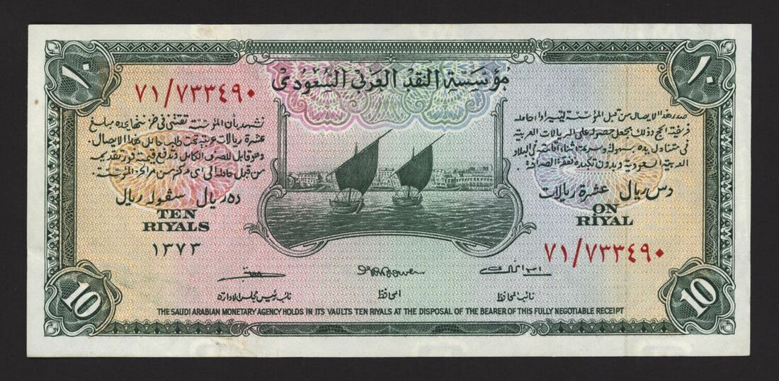 (x) Saudi Arabian Monetary Agency, Saudi Arabia, 10 riyals, ND (1954), serial number 71/733490, green on light yellow, pink and blue, boats at centre, Jiddah harbour in background, Salha, Blowers and al-Khalidi signatures, reverse, arms at left and right