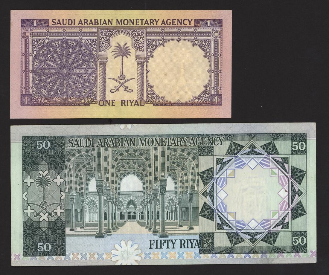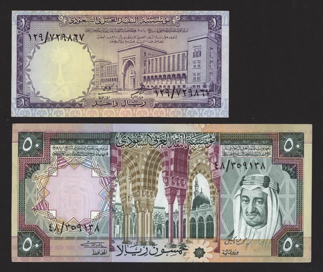 (x) Saudi Arabian Monetary Agency, Saudi Arabia, 1 riyal, 1379 (1968), purple, the Ministry of Foreign Affairs building at centre, also 50 riyals, 1379 (1976), prefix 48, green and purple, King Faisal at right