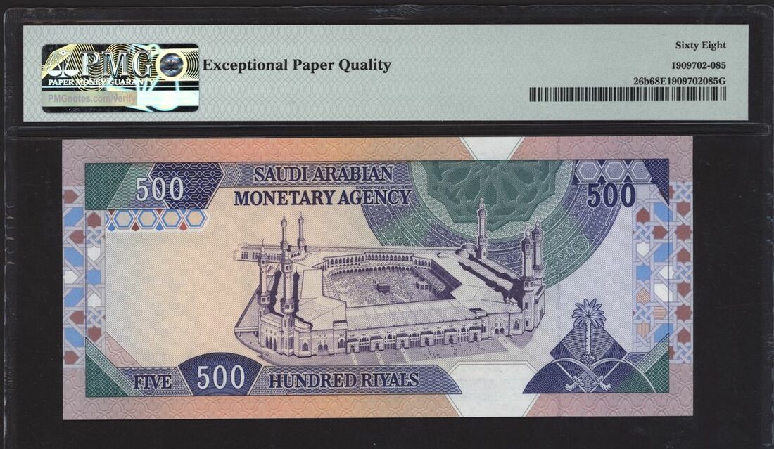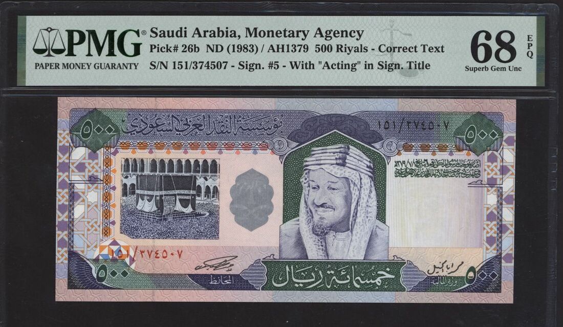 (x) Saudi Arabian Monetary Agency, Saudi Arabia, [Top Pop] 500 riyals, ND (1983), serial number 151/374507, (Pick 26b, BNB 125), in PMG holder 68 EPQ Superb Gem Uncirculated
