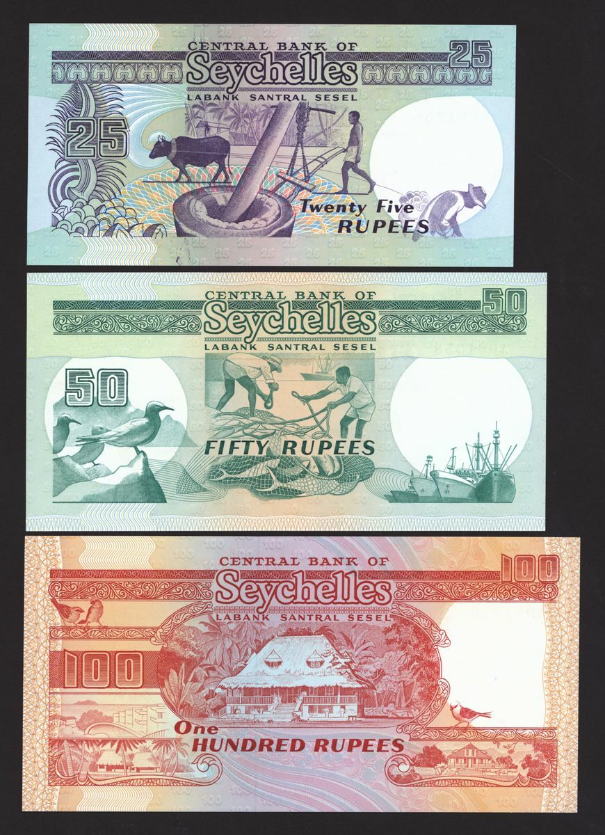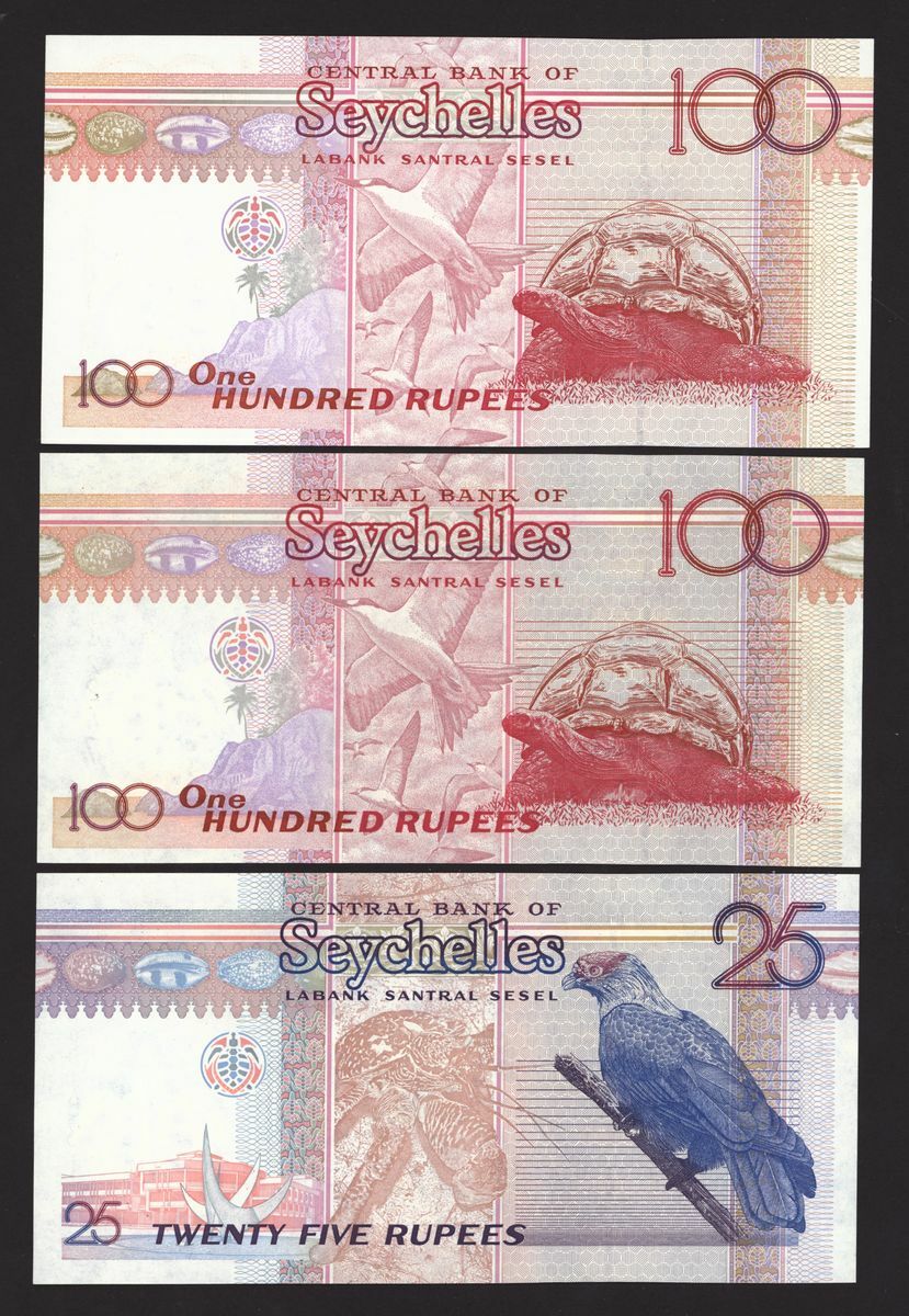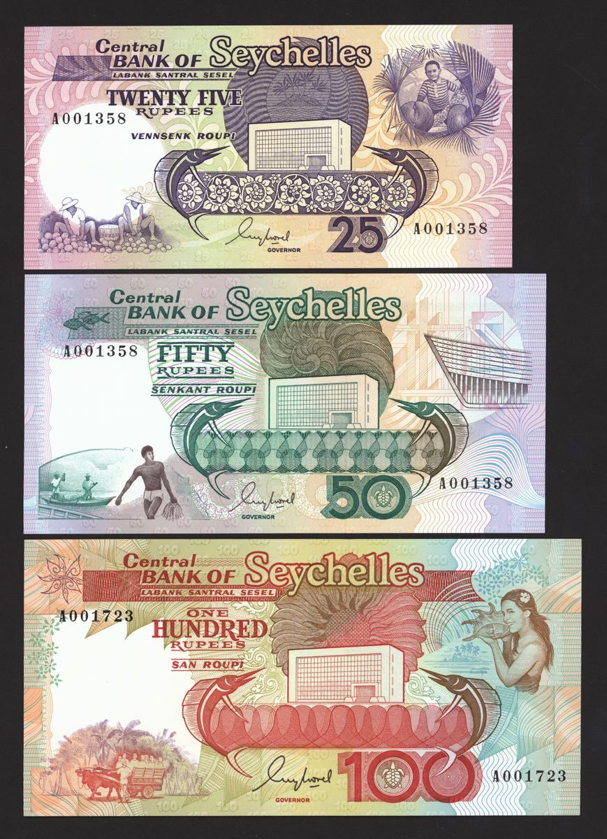 (x) Central Bank of Seychelles, a group of 6 notes, including 10 and 20 rupees, 1989, matching serial numbers A001358, 100 rupees 1989 serial number A001723, 25 and 100 rupees 1998, prefixes AA, 100 rupees 2000,