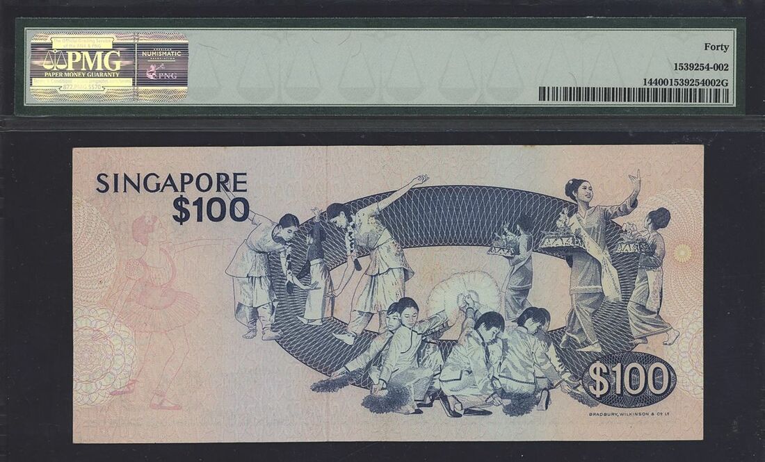 (x) Board of Commissioners of Currency, Singapore, 100 dollars, ND (1977), serial number A/7 605530, (Pick 14), in PMG holder 40 Extremely Fine