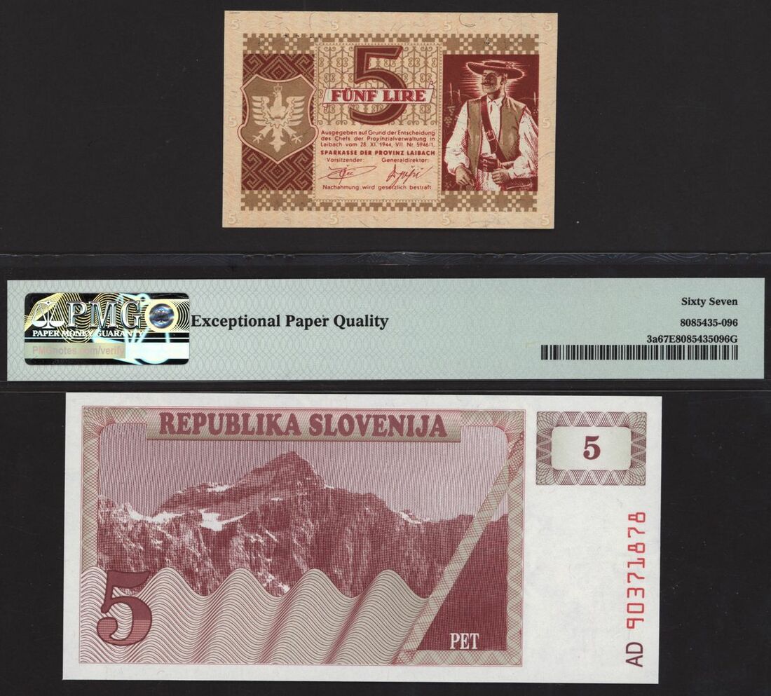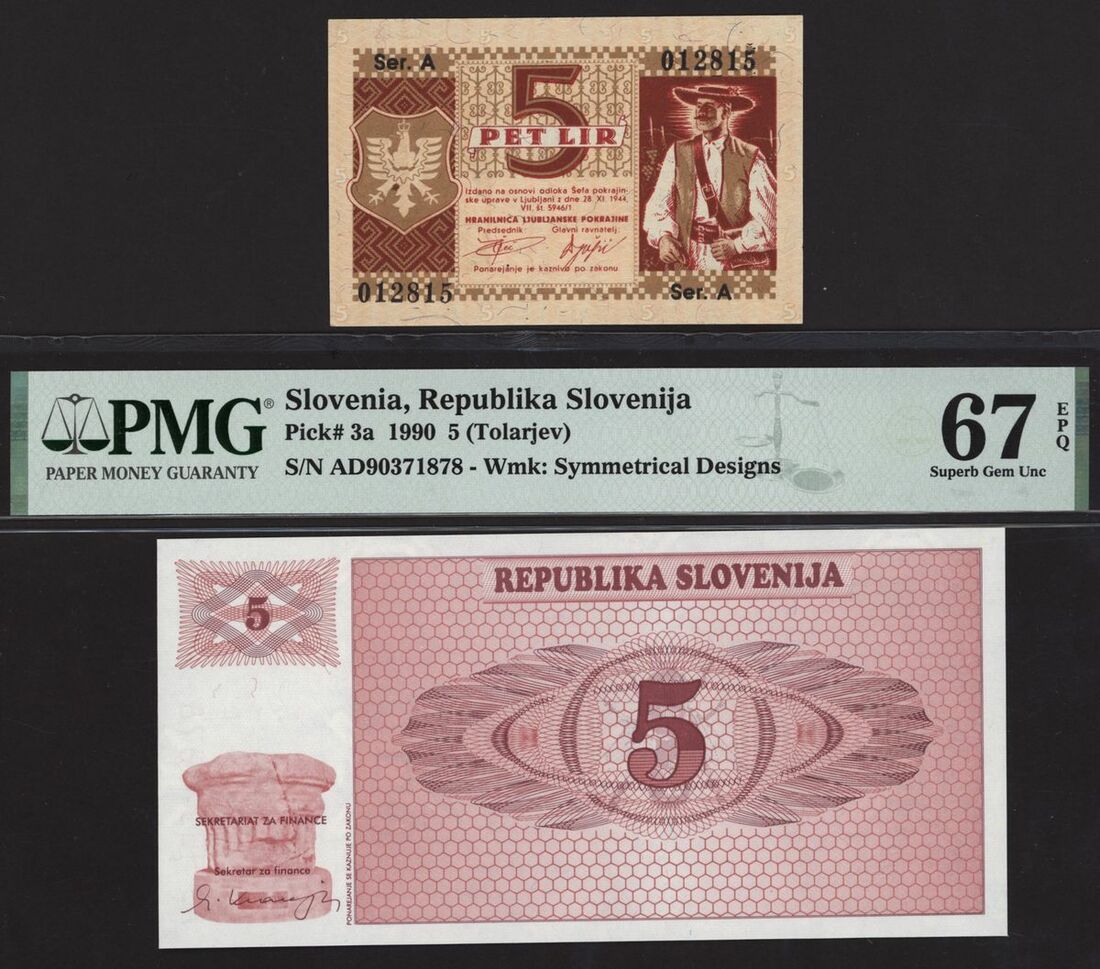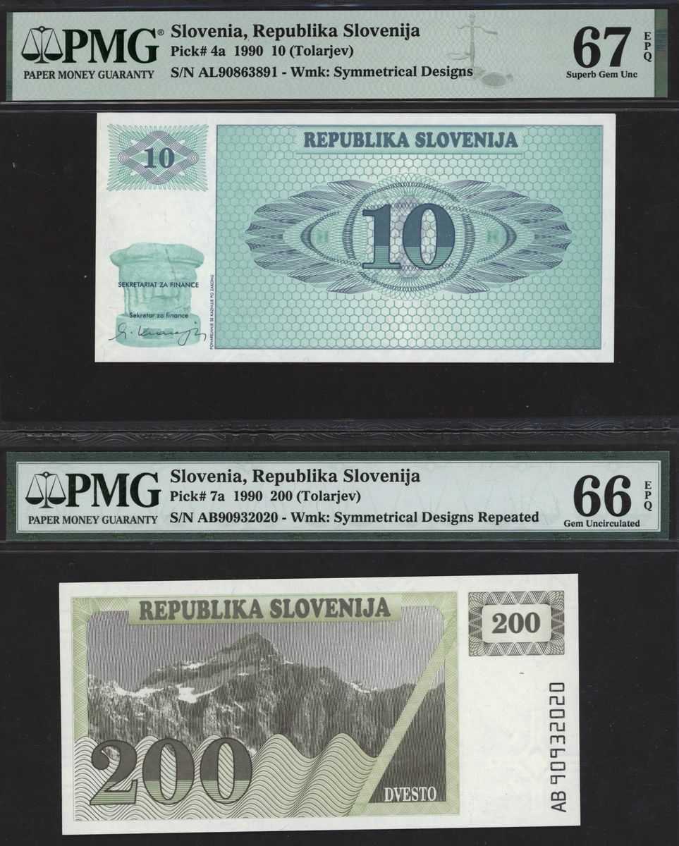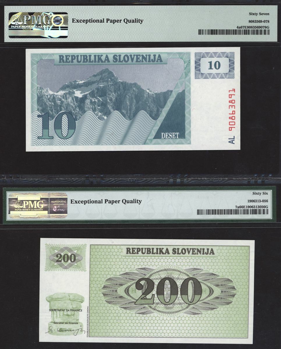 (Pick R4, 3a, 4a, 7a), 5 and 10 (tolarjev) in PMG holders 67 EPQ Superb Gem Uncirculated, 200 (tolarjev) in PMG holder 66 EPQ Gem Uncirculated, 5 lire uncirculated